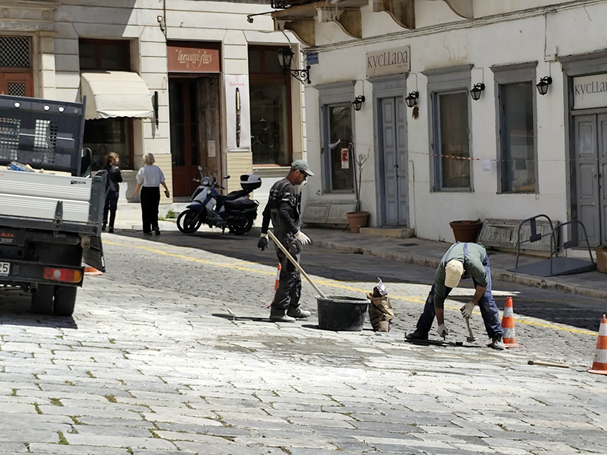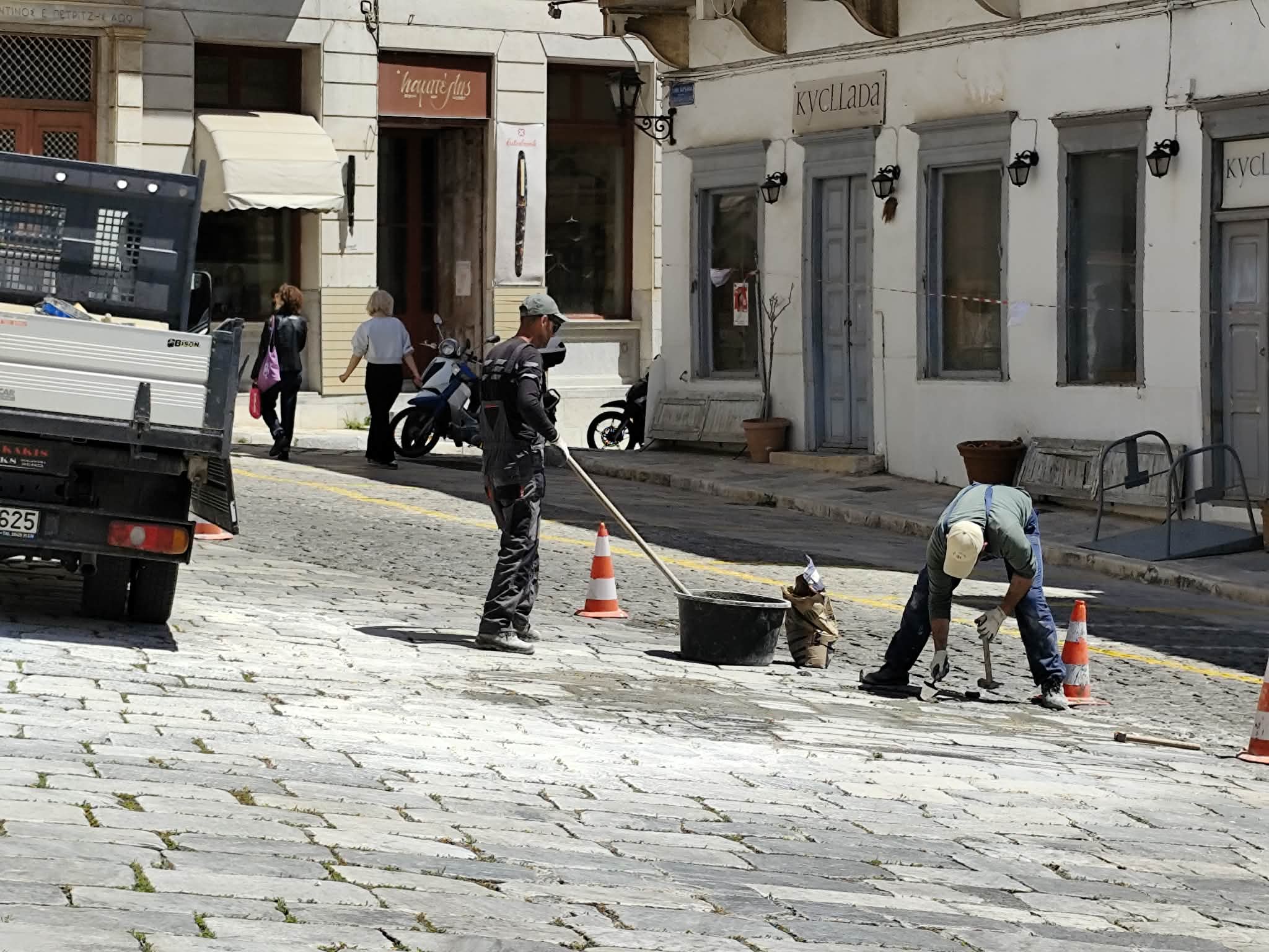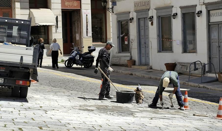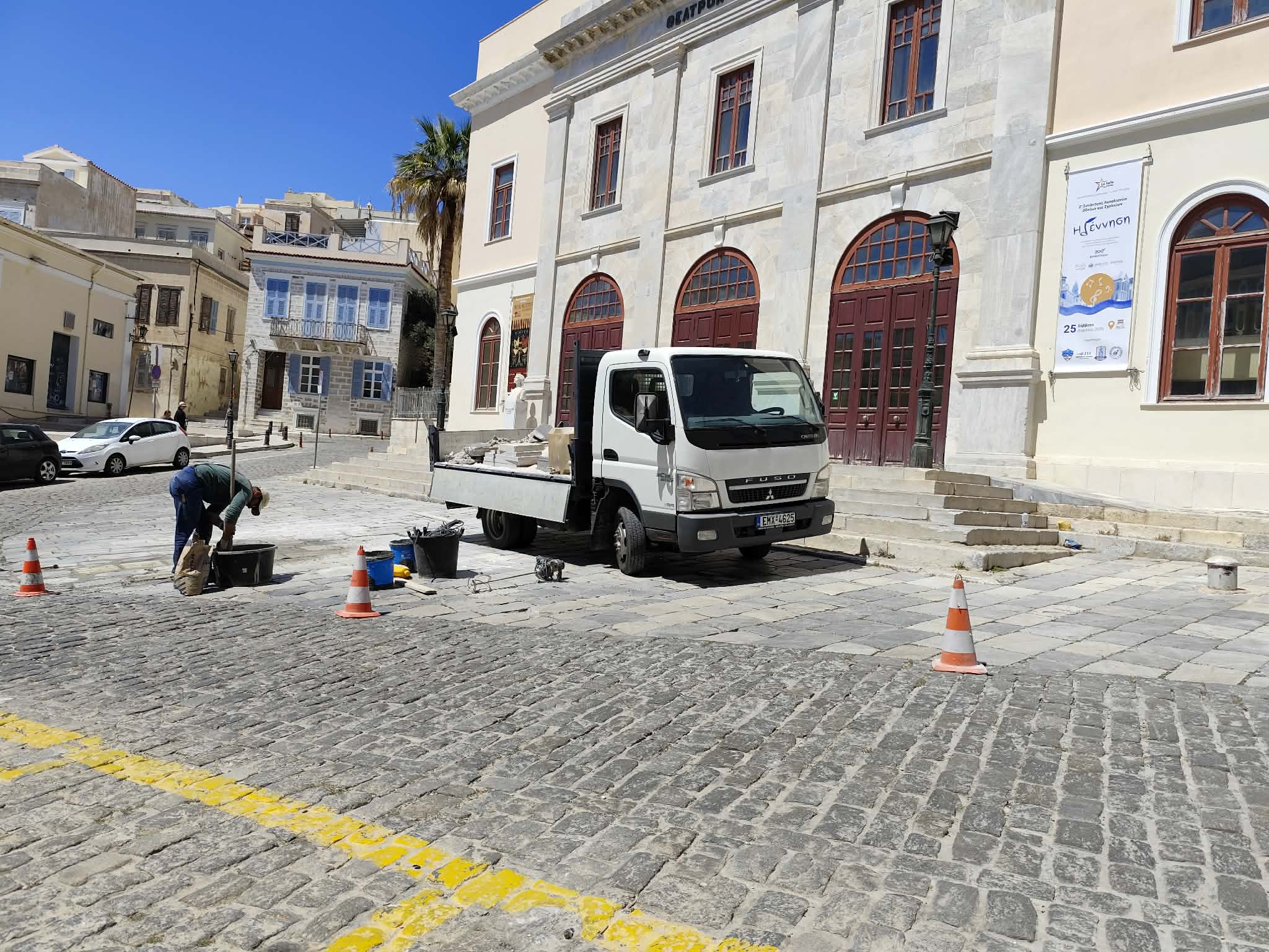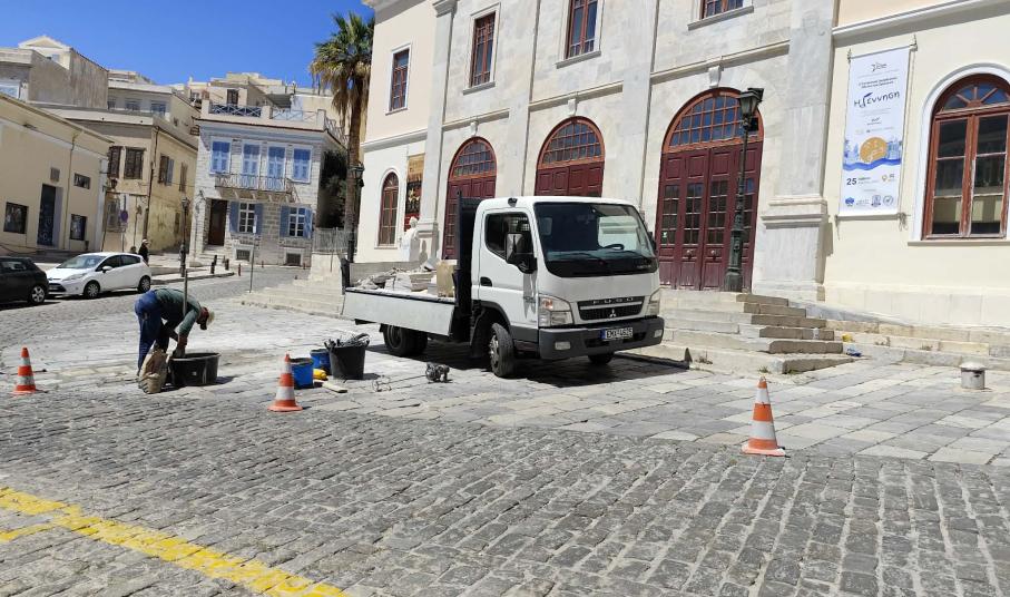 Συστηματικές εργασίες για αποκατάσταση του παραδοσιακού πλακόστρωτου μπροστά από την είσοδο του θεάτρου Απόλλων υλοποιεί ο Δήμος Σύρου – Ερμούπολης, προκειμένου οι μετακινήσεις πεζών και οδηγών να πραγματοποιούνται με ασφάλεια.Το συγκεκριμένο τμήμα του δρόμου, παρουσιάζει μεγάλες φθορές καθώς το σπάσιμο και η αποκόλληση πλακών έχει καταγραφεί ξανά και ξανά, με αποτέλεσμα η ροή των μηχανών να συνοδ