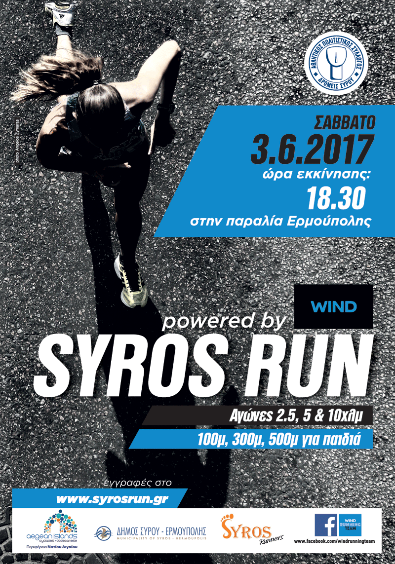 Πρόκειται για αγώνες δρόμου που θα πραγματοποιηθούν στην Ερμούπολη το τριήμερο του Αγίου Πνεύματος, το Σάββατο 3 Ιουνίου 2017. Οι αγώνες περιλαμβάνουν διαδρομές 2,5 χλμ, 5χλμ, 10 χλμ Ανδρών/Γυναικών και παράλληλες διαδρομές 100μ, 300μ και 500μ για παιδιά.