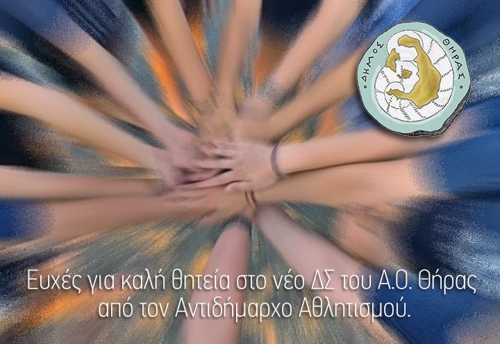 Ο κ. Στεφανάκης μεταφέροντας και τις ευχές του Δήμαρχου Θήρας Αντώνη Σιγάλα στο μήνυμα του αναφέρει τα εξής: "Ο Δήμος Θήρας εύχεται στον επανεκλεγέντα πρόεδρο του συλλόγου Α.Ο. Θήρας κ. Γιώργο Σκοπελίτη και τα μέλη του Διοικητικού Συμβουλίου να έχουν μία επιτυχημένη συνεχεία και στη νέα τους θητεία και να συνεχίσουν να φέρνουν νίκες στο νησί, δίνοντας το παράδειγμα στους νέους προάγοντας το αθλητικό πνεύμα".