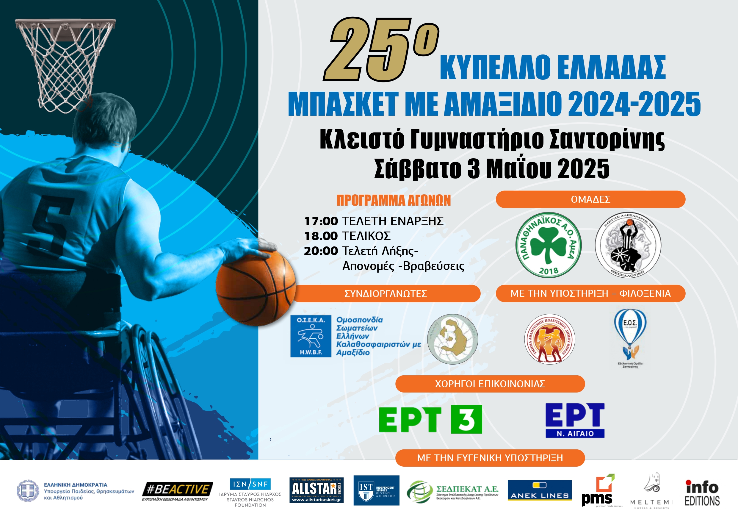 Η Ομοσπονδία Σωματείων Ελλήνων Καλαθοσφαιριστών με Αμαξίδιο (ΟΣΕΚΑ) και ο Δήμος Θήρας, με την υποστήριξη του Τμήματος Αθλητισμού - Πολιτισμού του Δήμου Θήρας και της Εθελοντικής Ομάδας Σαντορίνης, διοργανώνουν τον Τελικό του 25ου Κυπέλλου Ελλάδας Μπάσκετ με Αμαξίδιο.