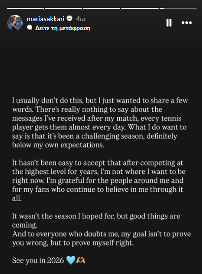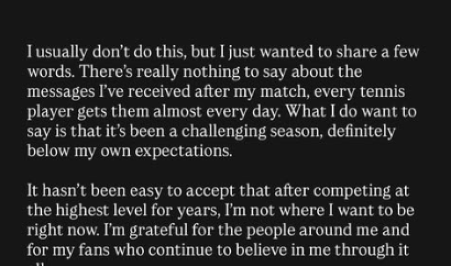 «Συνήθως δεν το κάνω αυτό, αλλά ήθελα να μοιραστώ λίγα λόγια. Δεν υπάρχει πραγματικά τίποτα να πω για τα μηνύματα που έλαβα μετά τον αγώνα μου. Κάθε τενίστας λαμβάνει αυτά τα μηνύματα καθημερινά.