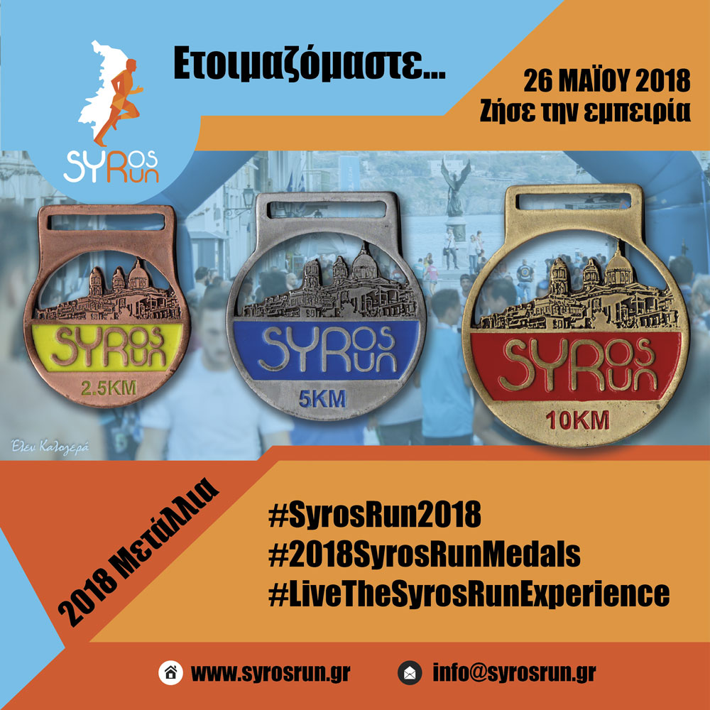 Η Περιφέρεια Νοτίου Αιγαίου, ο Δήμος Σύρου-Ερμούπολης και ο Αθλητικός Πολιτιστικός Σύλλογος – Δρομείς Σύρου, συνδιοργανώνουν αγώνες δρόμου 2,5 χλμ, 5 χλμ, 10 χλμ ανδρών και γυναικών. Επίσης θα υπάρξουν και παράλληλους αγώνες παιδιών 100μ. (για παιδιά προσχολικής αγωγής), 300μ. (από 6 ετών έως και 10 ετών), και 500 μ. (από 11 ετών και άνω), το τριήμερο του Αγ. Πνεύματος και πιο συγκεκριμένα το απόγευμα του Σαββάτου, 26 Μαϊού 2018 , στην Σύρο.