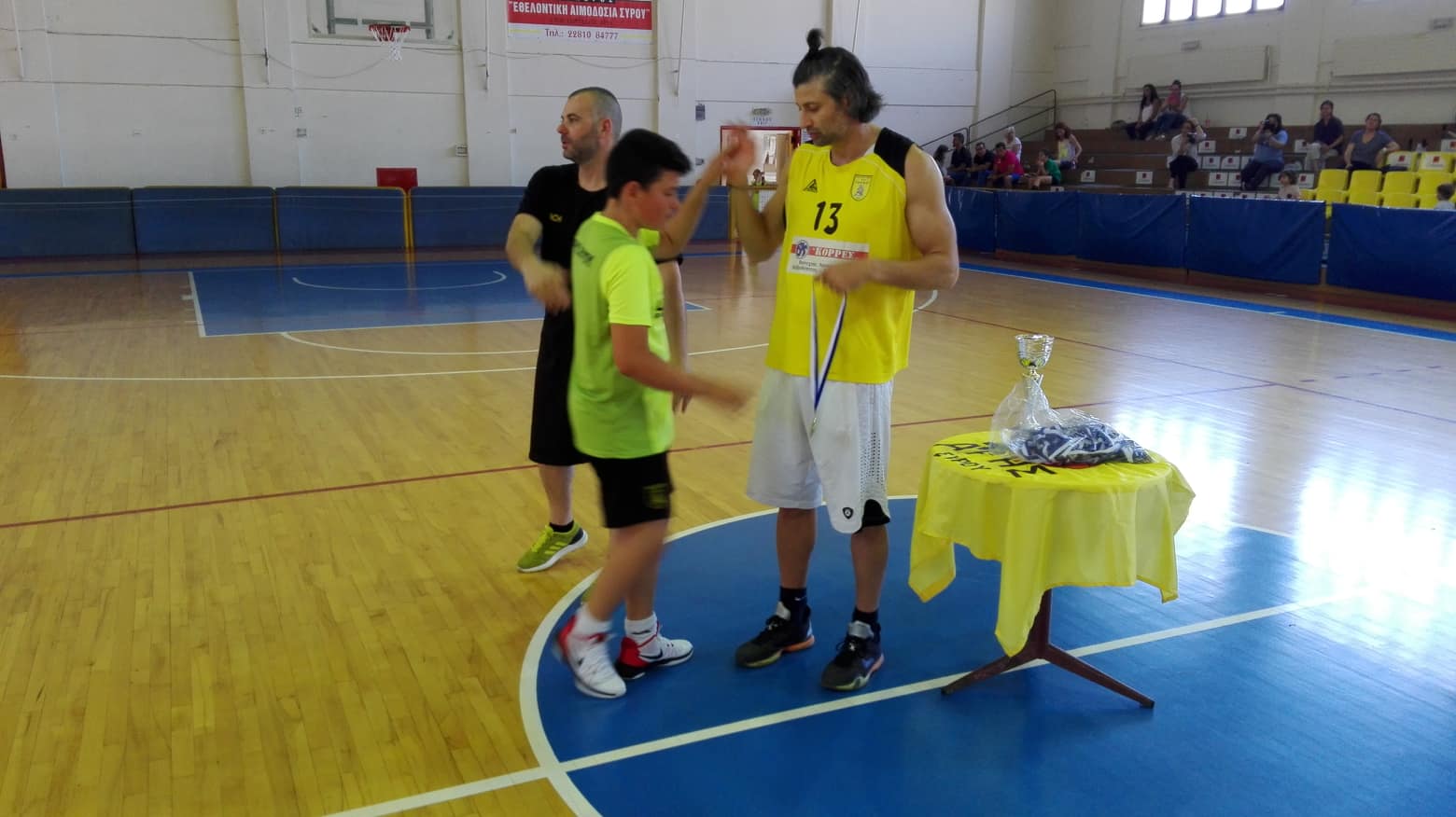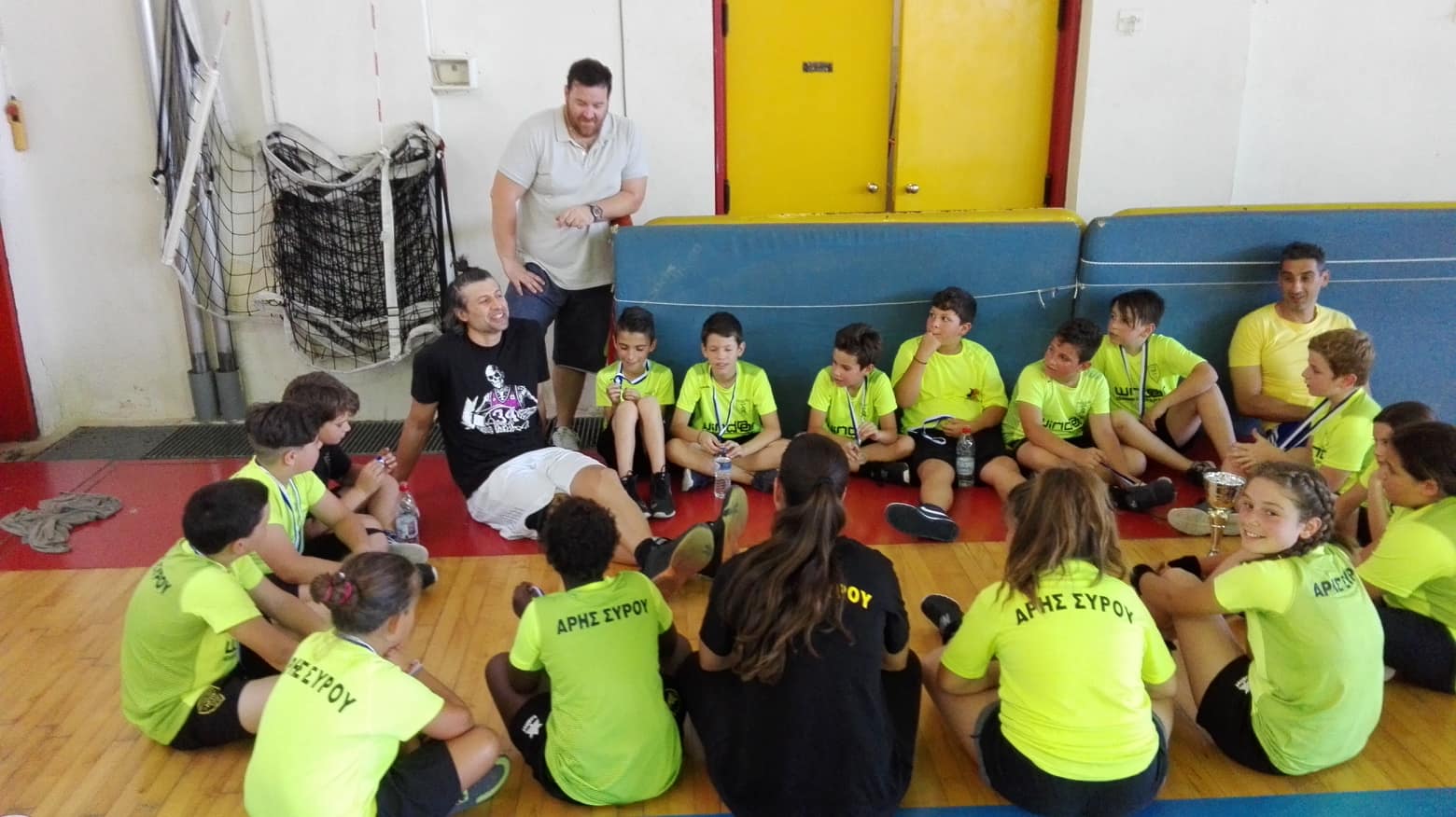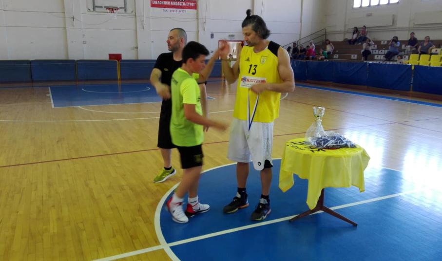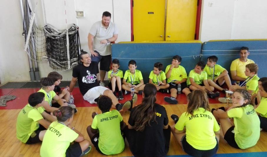 Ο λόγος για τον Αβραάμ Καλλινικίδη, έναν αθλητή με μεγάλη καριέρα στην Α1 κατηγορία του μπάσκετ (Αιγάλεω, ΑΕΚ, Ρέθυμνο, Αρκαδικό), ο οποίος βρέθηκε στη Σύρο για να δει την προσπάθεια των παιδιών και να συζητήσει μαζί τους. Παράλληλα, ο Άρης Σύρου τον τίμησε για την προσφορά του στο ελληνικό μπάσκετ και τον αθλητισμό γενικότερα.