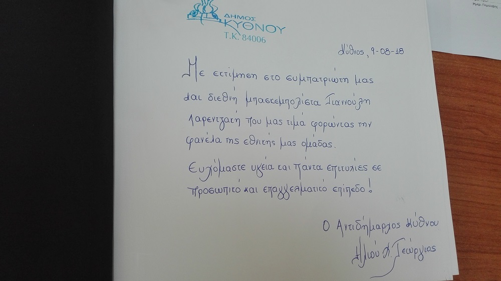 Χθες 9 Αυγούστου 2018 επισκέφθηκε το Δημαρχείο , ο διεθνής καλαθοσφαιριστής Λαρεντζάκης Γιαννούλης. Ο κυθνιώτης αθλητής μετά το πέρας της συμμετοχής του στη α’ φάση των προκριματικών του Παγκοσμίου Κυπέλλου με την Εθνική μας Ομάδα βρίσκεται στην Κύθνο για ολιγοήμερες διακοπές κοντά στην οικογένεια του.