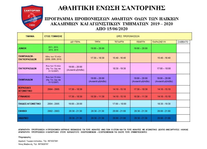 Με ανακοίνωσή της η Α.Ε. Σαντορίνης έκανε γνωστό τόσο στους γονείς όσο και στους αθλητές το νέο πρόγραμμα προπονήσεων, αλλά και όλα τα δικαιολογητικά που απαιτούνται ώστε να τηρηθούν όλα τα μέτρα ασφαλείας.