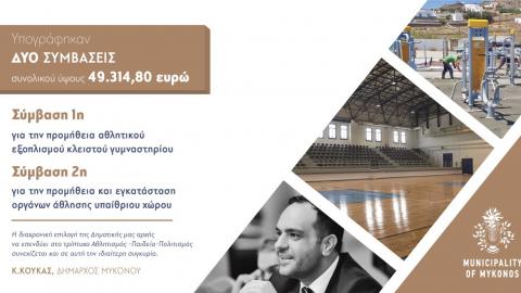 Ο Δήμος Μυκόνου στο πλαίσιο της έμπρακτης στήριξης του Αθλητισμού προχώρησε στην υπογραφή δύο συμβάσεων για την προμήθεια αθλητικού εξοπλισμού κλειστού γυμναστηρίου και την προμήθεια και εγκατάσταση άθλησης υπαίθριου χώρου, αντίστοιχα.