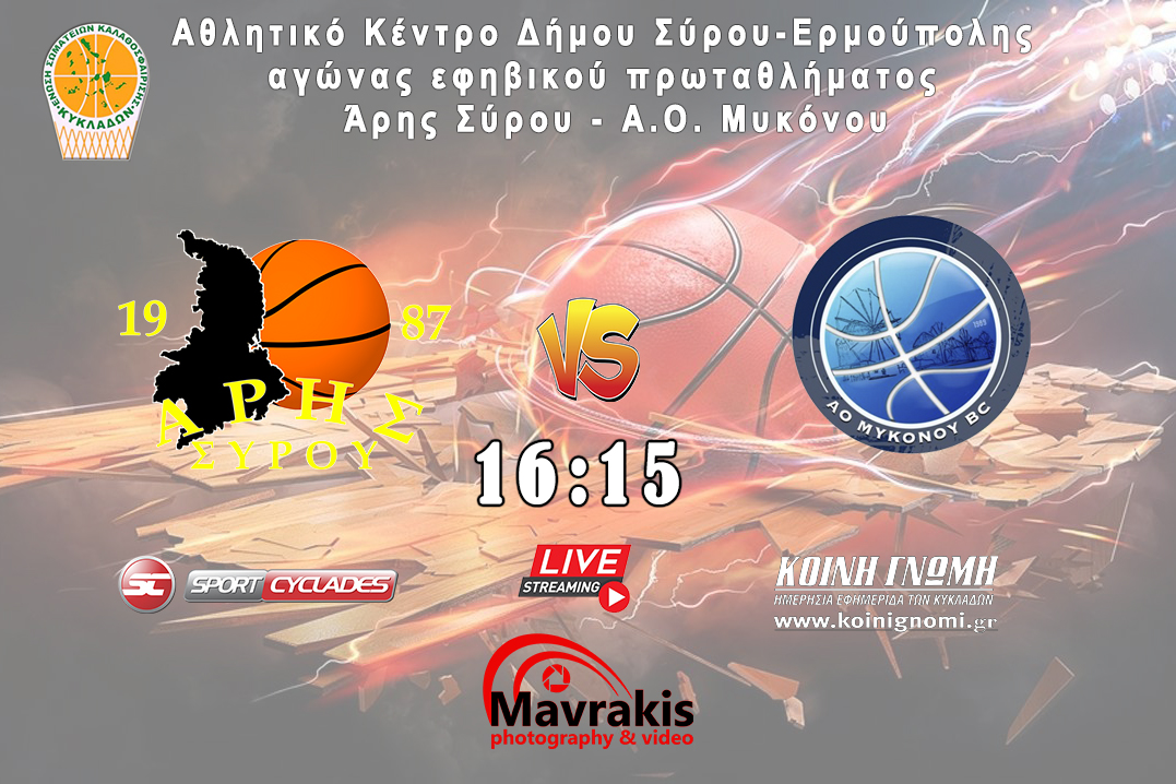 Παρακολουθείστε από το κλειστό του αθλητικού κέντρου του Δήμου Σύρου-Ερμούπολης το παιχνίδι του εφηβικού πρωταθλήματος μεταξύ του Άρη Σύρου με τον Α.Ο. Μυκόνου. Το ματς είναι προγραμματισμένο να ξεκινήσει στις 16:15.