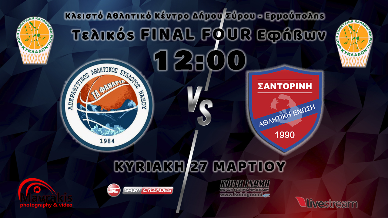 Παρακολουθήστε σε ζωντανή μετάδοση από το κλειστό γυμναστήριο της Σύρου τον Τελικό του Final-4 Εφήβων της ΕΣΚ Κυκλάδων μεταξύ του ΑΠΑΣ Νάξου ''Τα Φανάρια'' και της ΑΕ Σαντορίνης.