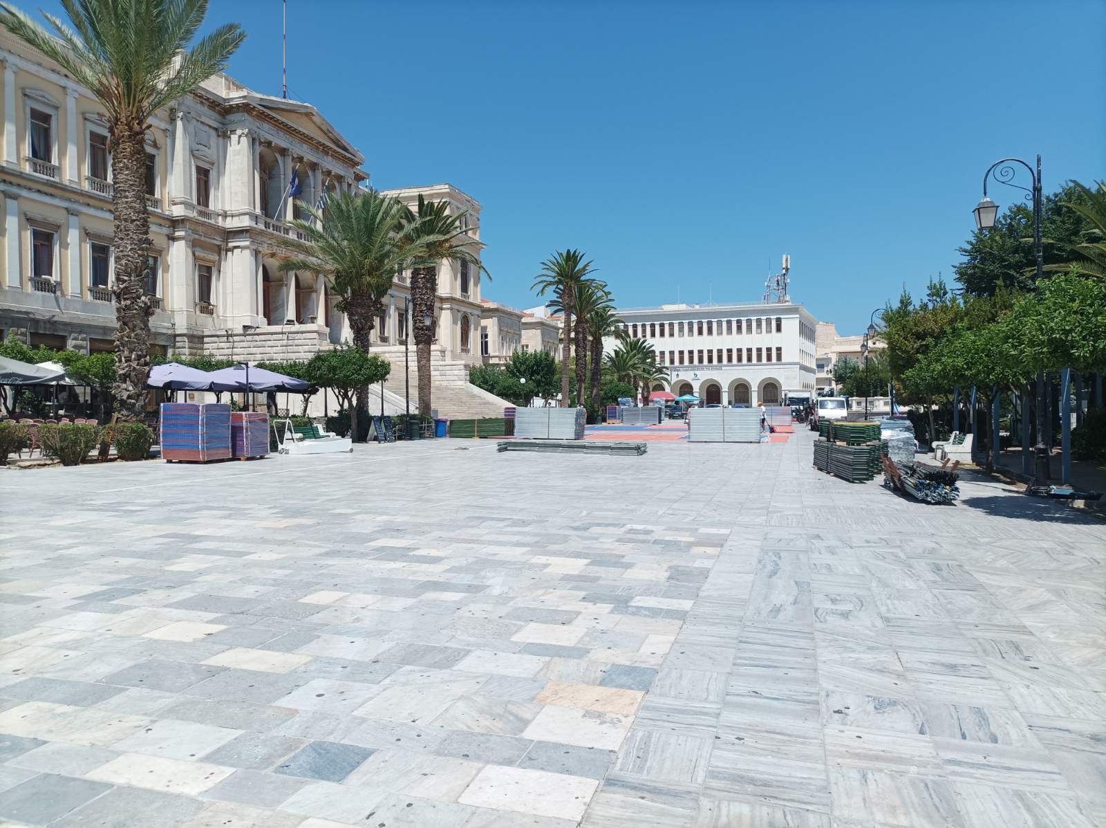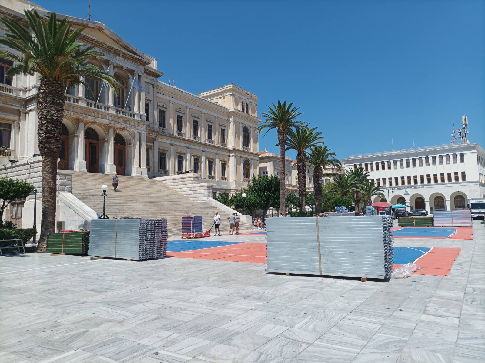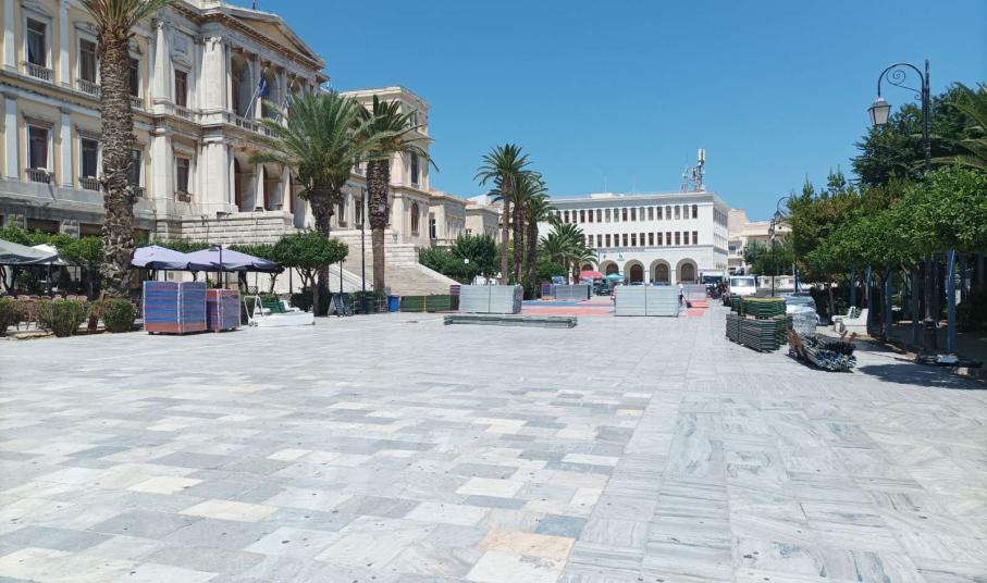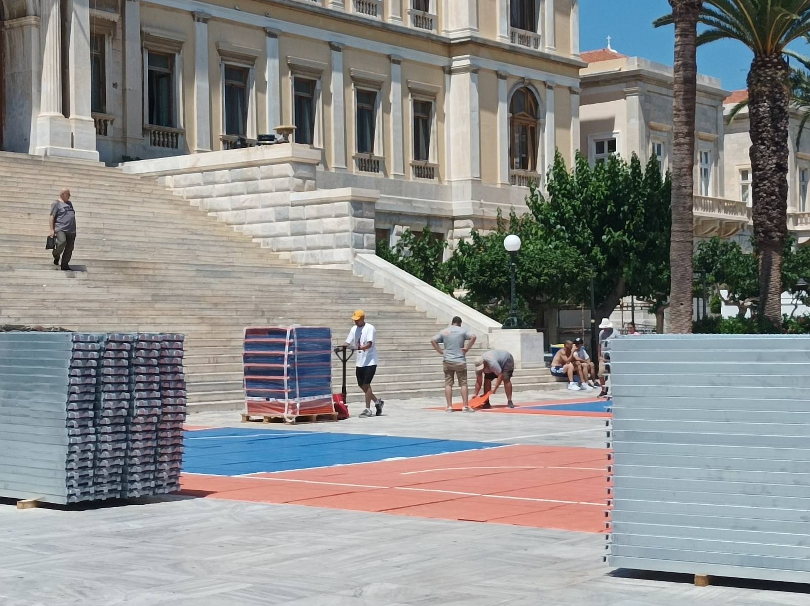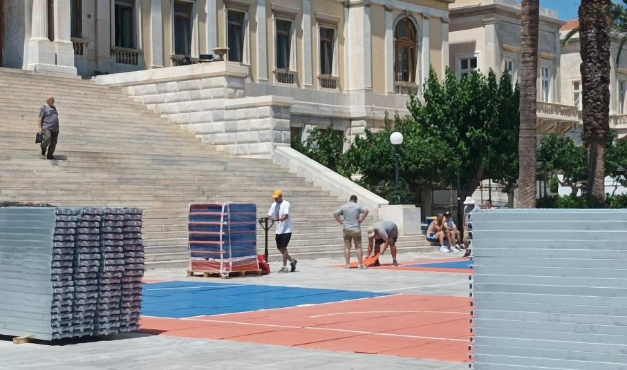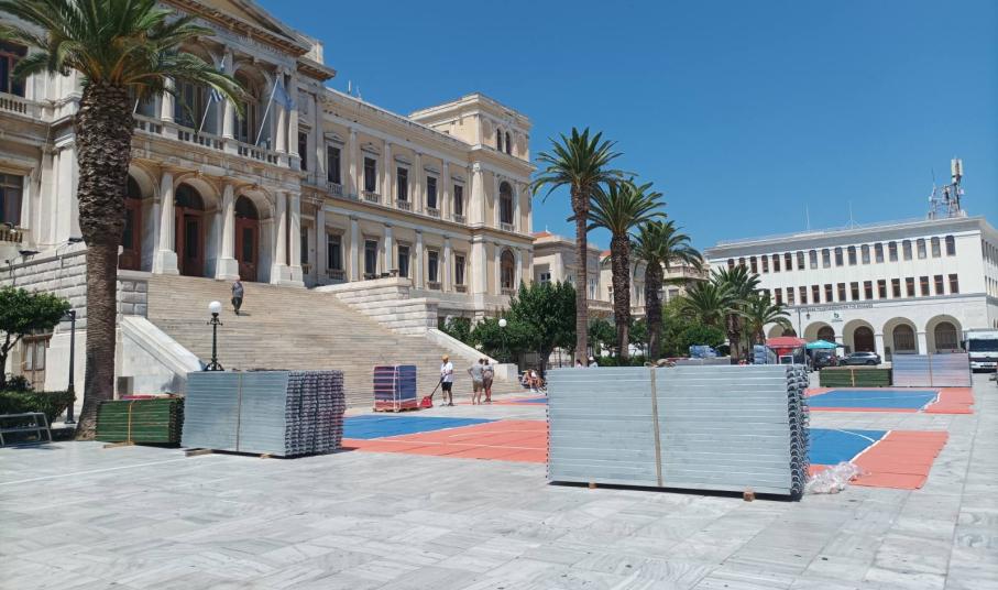 Η κεντρική πλατεία της Σύρου (Πλατεία Μιαούλη) μετατρέπεται σε ένα μεγάλο γήπεδο μπάσκετ, όπου σε λίγες ημέρες θα αγωνιστούν αθλητές εγνωσμένης αξίας. Τα έργα κατασκευής των γηπέδων και των εξεδρών άρχισαν και αναμένεται σύντομα να έχουν ολοκληρωθεί, με την πλατεία να παίρνει μία γνώριμη, για τους φίλους του αθλήματος, μορφή.