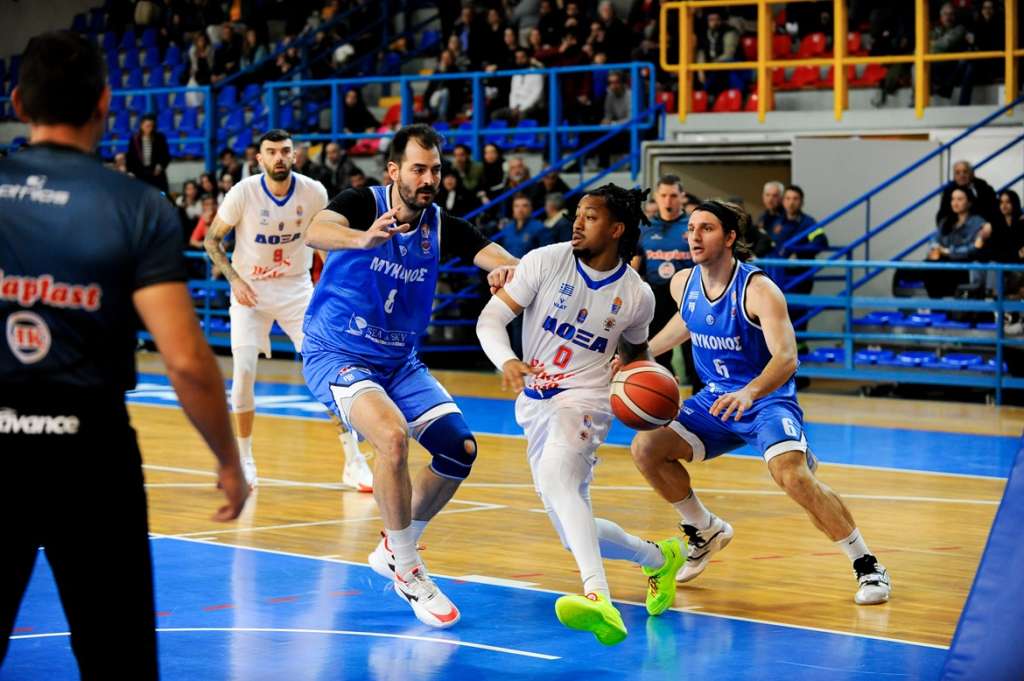 Την ήττα στο εκτός έδρας παιχνίδι της με 84-83 γνώρισε ο Α.Ο. Μυκόνου από την Δόξα Λευκάδας. Το παιχνίδι ήταν από την αρχή μέχρι το τέλος του συναρπαστικό και κρίθηκε με μία εύστοχη βολή 2 δευτερόλεπτα πριν το φινάλε. Συγκεκριμένα ο Ντόναλντσον πρόλαβε και κέρδισε φάουλ λίγο πριν το φινάλε και ευστόχησε στη δεύτερη από τις δύο βολές και έκανε το τελικό 84-83, χαρίζοντας το ροζ φύλλο αγώνα στην ομάδα του.