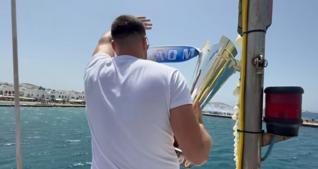 Ο κόσμος είχε μαζευτεί από νωρίς στο λιμάνι και φώναζε συνθήματα όπως το «Βουντού Βουντού, Μύκονο είσαι μια, το κύπελλο το φέραμε από τη Θεσσαλία» ενώ όταν το πλοίο έδεσε στον κάβο έγινε... χαμός.
