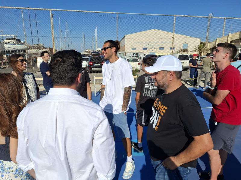 Στη συνέχεια ο παλαίμαχος καλαθοσφαιριστής έκανε το πρώτο σουτ στο ανακατασκευασμένο ανοικτό γήπεδο μπάσκετ και το οποίο ήταν εύστοχο.