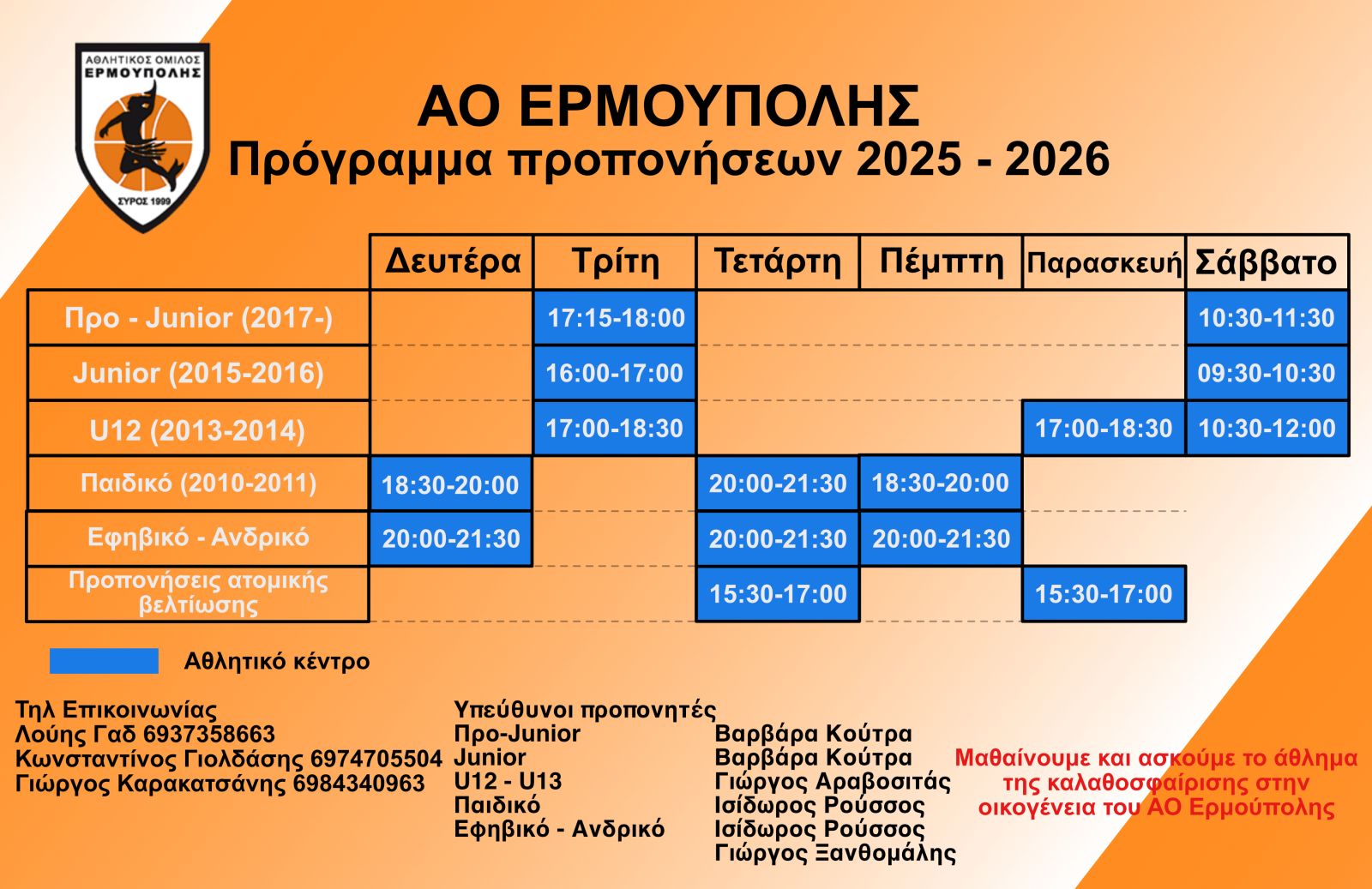 Οι προπονήσεις θα γίνονται στο ανοικτό γήπεδο του Αθλητικού κέντρου του Δήμου Σύρου – Ερμούπολης. Να σημειώσουμε εδώ πως υπεύθυνοι προπονητές για τα τμήματα είναι οι εξής: Pro junior / Junio: Βαρβάρα Κούτρα, U12 και U13: Γιώργος Αραβοσιτάς, Παιδικό: Ισίδωρος Ρούσσος, Εφηβικό/ Ανδρικό: Ισίδωρος Ρούσος, Γιώργος Ξανθομάλης.