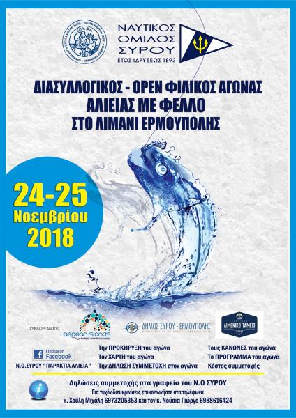 Σας προσκαλούμε να παρακολουθήσετε τους αγώνες Παράκτιας με την επωνυμία ‘’Διασυλλογικός Αγώνας Παράκτιας Αλιείας με Φελλό από Λιμενικές Εγκαταστάσεις’’ που θα διεξαχθούν στο Λιμάνι της Ερμούπολης, το Σάββατο 24 και την Κυριακή 25 Νοεμβρίου 2018.