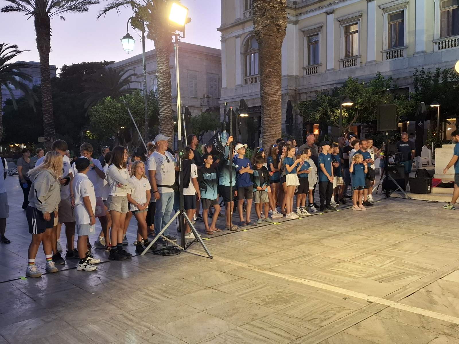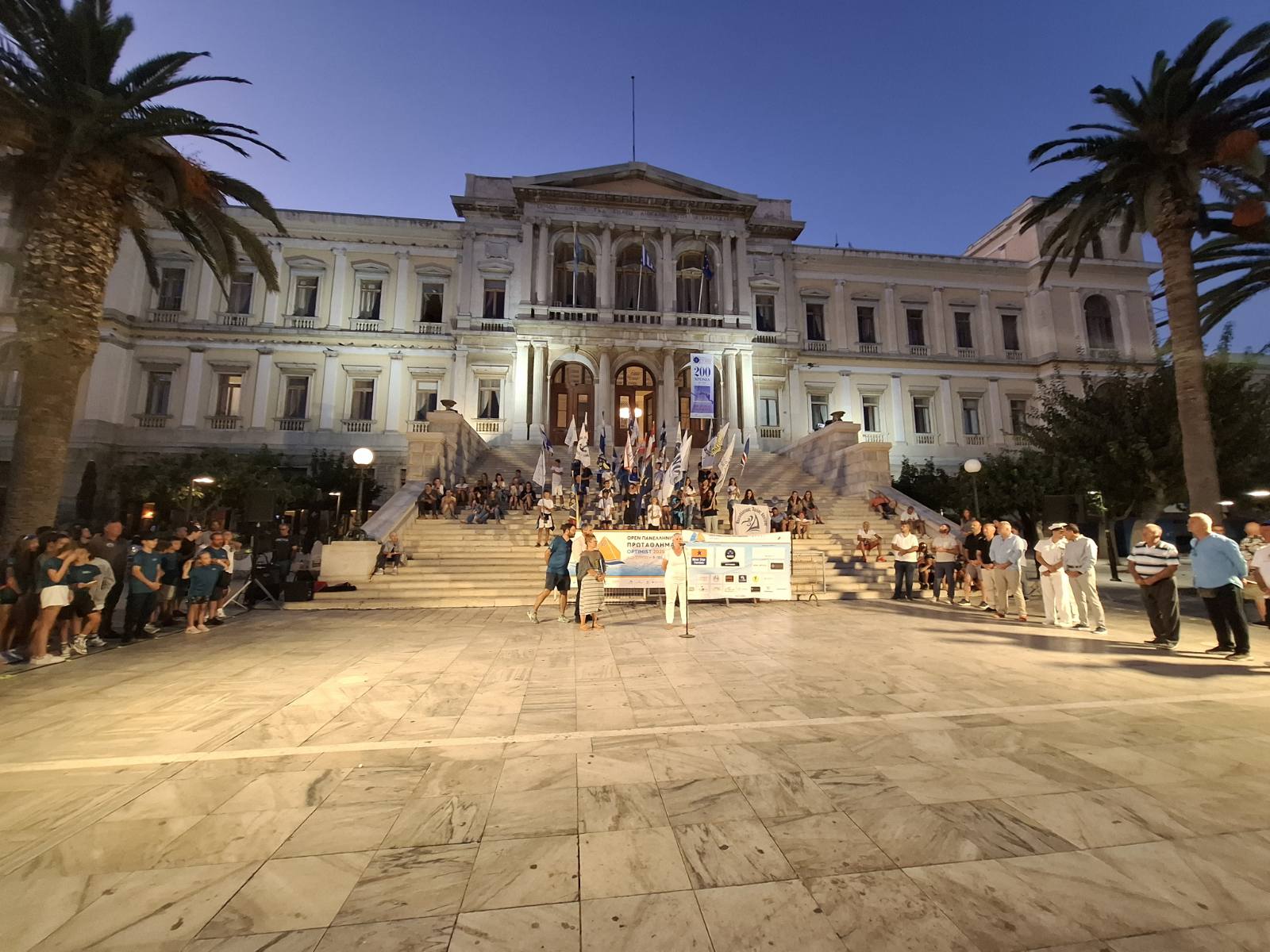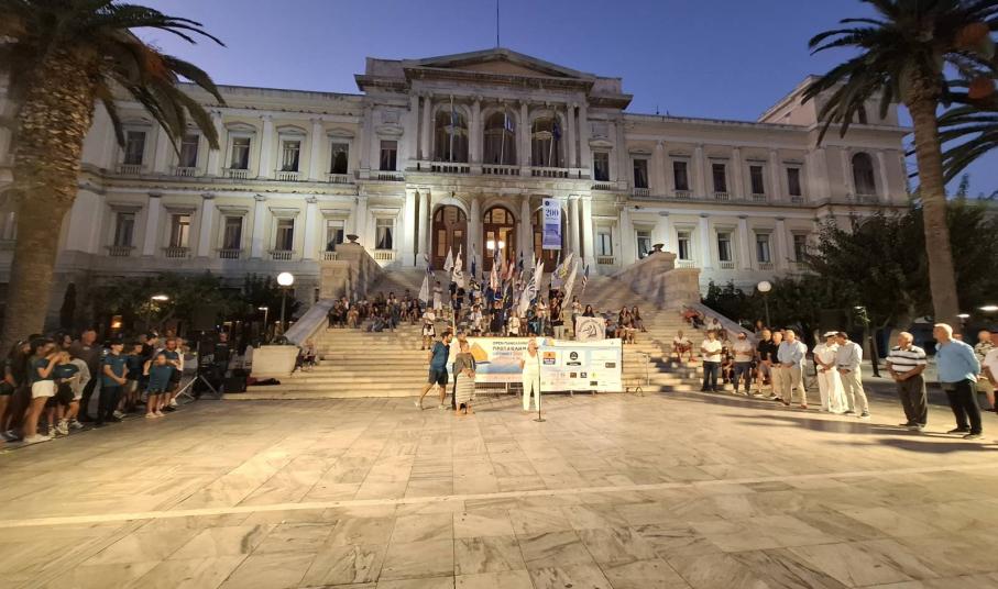 Εκεί συγκεντρώθηκαν όλοι αθλητές με τις σημαίες των ομίλων τους και δημιούργησαν μία άκρως εντυπωσιακή εικόνα. Ο πρόεδρος του Ναυτικού Ομίλου Σύρου, Ιάκωβος Γκίζης κατά τη διάρκεια του σύντομου χαιρετισμού του, καλωσόρισε τους αθλητές και τους συνοδούς τους και ευχήθηκε σε όλους να έχουν έναν ωραίο αγώνα. Ταυτόχρονα, ευχαρίστησε όλους όσους συνέβαλαν στη διεξαγωγή του πρωταθλήματος, αλλά και το Τμήμα Καθαριότητας του Δήμου όπου έκανε ότι χρειάστηκε, έτσι ώστε τα πάντα να βρίσκονται στην εντέλεια.