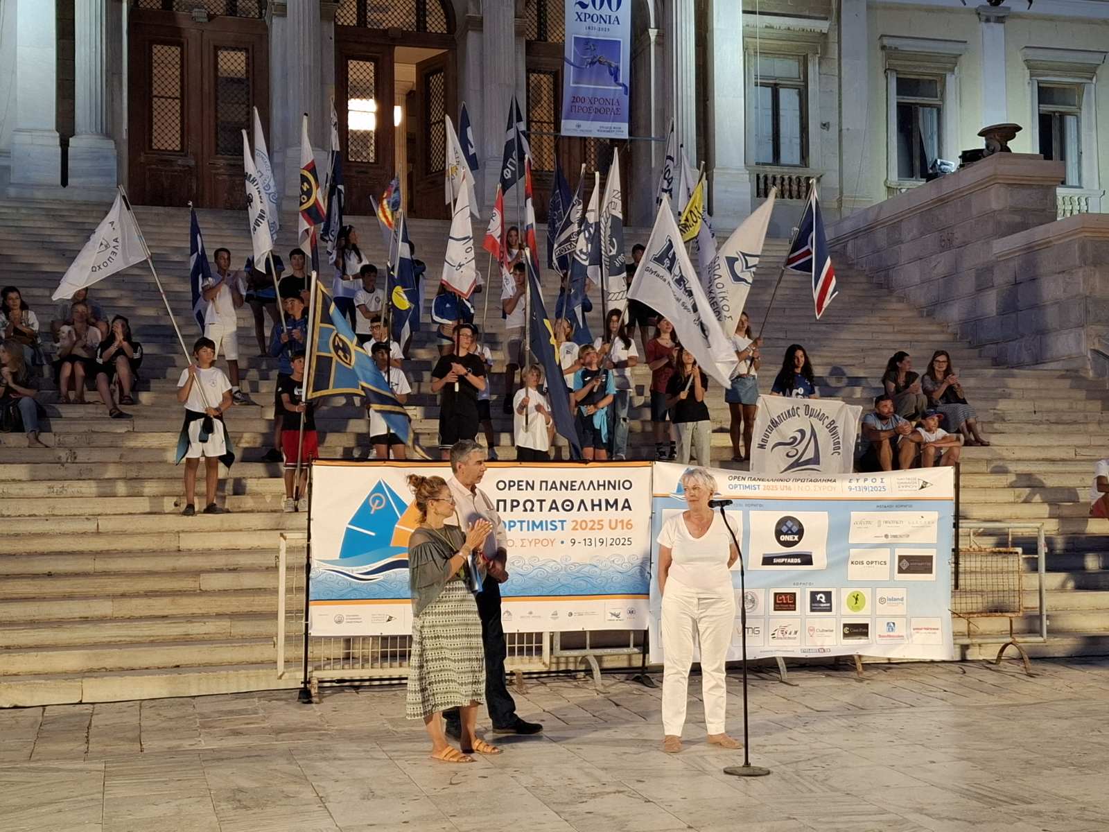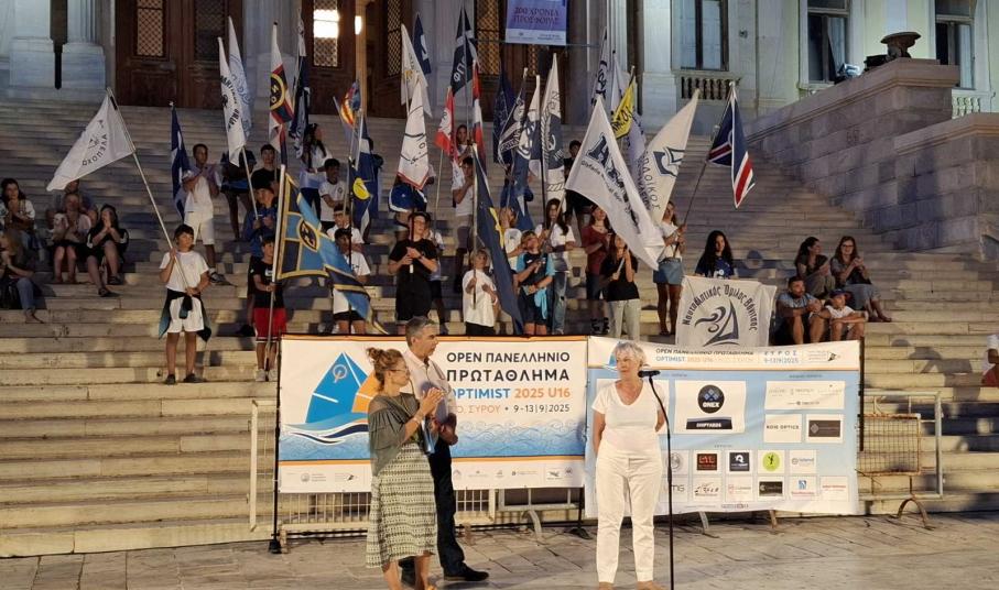 Από την πλευρά της, η πρόεδρος της Ελληνικής Ιστιοπλοϊκής Ομοσπονδίας,  Νίκη Αναστασίου μίλησε κατά τη διάρκεια της τελετής έναρξης των αγώνων, τονίζοντας πως «για ακόμη μία χρονιά συναντιόμαστε στο πιο θρυλικό πρωτάθλημα της παγκόσμιας ιστιοπλοΐας, που είναι το πρωτάθλημα optimist. Είναι δημοφιλές γιατί είσαστε εσείς. Τα παιδιά, αγόρια και κορίτσια που αγωνίζεστε όμορφα, με πάθος, γι’ αυτό σας δίνουμε σε όλους μία μεγάλη αγκαλιά. Σας καλωσορίζουμε στην όμορφη Σύρο όπου βρίσκεται εδώ το επιτελείο της Ομοσπονδίας. Όλοι είμαστε εδώ για να βοηθήσουμε τον Ναυτικό Όμιλο Σύρου για να γίνει ένα όμορφο πρωτάθλημα. Περνάμε μία ευτυχισμένη περίοδο στην Ελληνική Ομοσπονδία Ιστιοπλοΐας, διότι ακόμη και τώρα μετράει 47 παγκόσμια και ευρωπαϊκά μετάλλια που έχουν φέρει οι συναθλητές και συναθλήτριές σας, μέσα στο 2025. Ανάμεσα σ’ αυτά τα μετάλλια είναι του Νίκου Παπά από τον Ναυτικό Όμιλο Βόνιτσας και της Ελένης Τριάδου του Ναυτικού Ομίλου Παλαιού Φαλήρου που βρίσκεται κοντά μας. Μέσα στο 2025 τα σαρώσαμε όλα και φυσικά σας αξίζουν πολλά συγχαρητήρια».