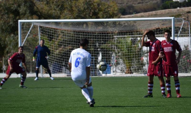 Ο Τόσκας στο 9' με ωραίο σουτ από το ύψος της μεγάλης περιοχής άνοιξε το σκορ για την ομάδα της Μυκόνου. Στη συνέχεια οι γηπεδούχοι έχασαν αρκετές ευκαιρίες όμως δεν κατάφεραν να πετύχουν κάποιο άλλο τέρμα μέχρι το φινάλε του πρώτου ημιχρόνου.