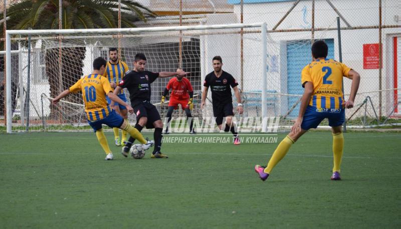 Η πρώτη καλή φάση ήταν για την ομάδα του Α.Ο. Σύρου, καθώς ο Περιάλης στο 5', προσπάθησε με δυνατό σουτ από το ύψος της περιοχής να κινήσει τον Κουκή, αλλά η μπάλα πέρασε δίπλα από το δεξί κάθετο δοκάρι του Πάγου.