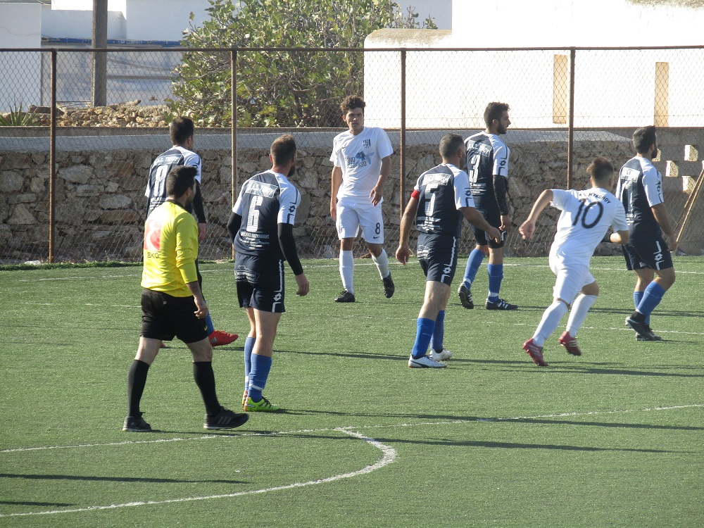 Τώρα όσον αφορά το αγωνιστικό σκέλος της αναμέτρησης, οι γηπεδούχοι ήταν το «αφεντικό» της αναμέτρησης από το πρώτο έως και το τελευταίο λεπτό του αγώνα. Ο δυνατός άνεμος έπαιξε κι αυτός το ρόλο του, αφού οι φιλοξενούμενοι έδειξαν να δυσκολεύονται αρκετά ιδιαίτερα στο πρώτο μέρος όπου και τον είχαν κόντρα. Οι παίκτες της Μυκόνου πριν την επίτευξη του πρώτου τέρματος δημιούργησαν κι άλλες καλές στιγμές, όμως ο Καραΐνδρου ήταν αυτός που έστειλε τη μπάλα στα δίχτυα στο 15’. Οι γηπεδούχοι συνέχισαν να πιέζουν αφού ήθελαν να κλείσουν το πρώτο μέρος με σκορ ασφαλείας. Στο 44’ ο Αλεξανδρόπουλος μετά από ωραία ασίστ του Καραΐνδρου, βρέθηκε απέναντι στον Κελαδίτη και με ψύχραιμο πλασέ έκανε το 2-0. Με την έναρξη του δευτέρου μέρους οι φιλοξενούμενοι βγήκαν με στόχο να μειώσουν το σκορ, πίεσαν τους Μυκονιάτες, όμως δεν κατάφεραν να δημιουργήσουν κάποια καλή ευκαιρία.