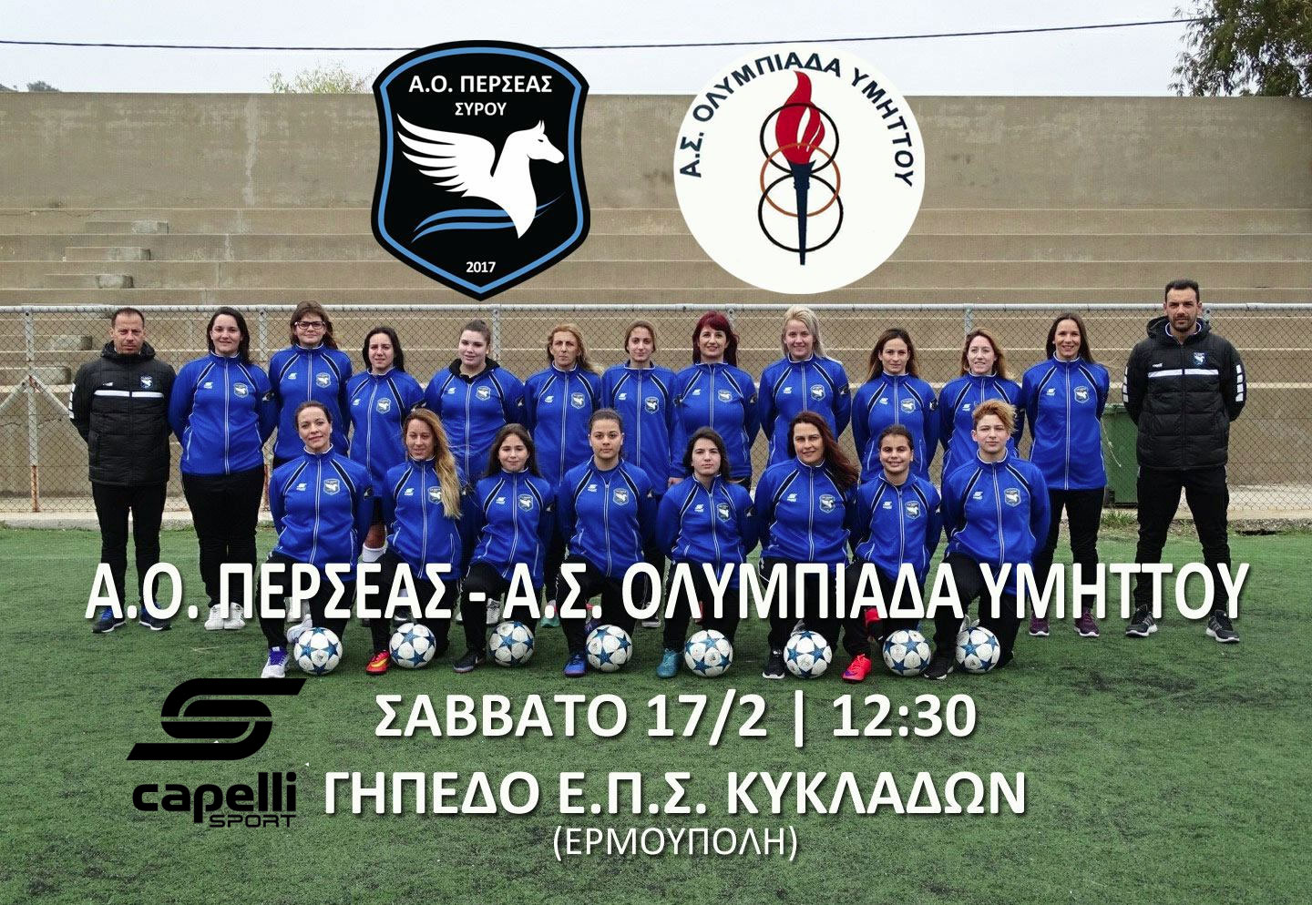 Φιλικό αγώνα έχει προγραμματίσει το νεοσύστατο σωματείο ποδοσφαίρου γυναικών του Α.Ο. ΠΕΡΣΕΑ Σύρου με την ομάδα του Α.Σ. Ολυμπιάδας Υμηττού αυτό το Σάββατο 17/2 και ώρα 12:30 στο Γήπεδο της Ε.Π.Σ. Κυκλάδων στην Ερμούπολη (δίπλα στην ΔΕΗ).