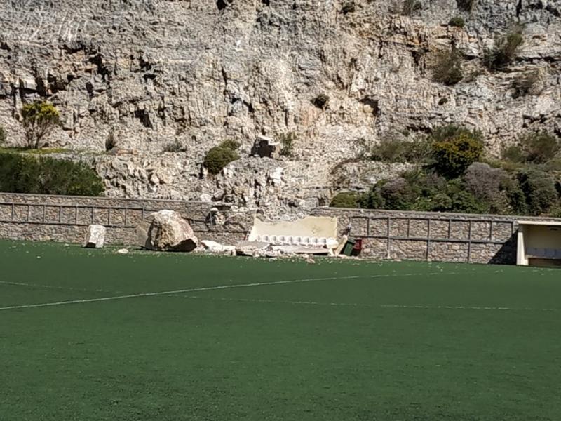 Τύχη… βουνό είχαν όλοι οι αθλητές που προπονούνται στο γήπεδο της Άνω Σύρου, αφού το απόγευμα της Τρίτης μεγάλο κομμάτι βράχου αποκολλήθηκε από το βουνό πλάγια του γηπέδου με αποτέλεσμα να βρεθεί εντός αγωνιστικού χώρου. Από την πτώση του βράχου αρχικά καταστράφηκε ολοσχερώς ο ένας πάγκος και ο πέτρινος εξωτερικός τοίχος. Ενώ κανείς δεν ξέρει τι φθορές έχουν προκληθεί εντός αγωνιστικού χώρου, καθώς οι ογκώδεις βράχοι είναι εντός του αγωνιστικού χώρου. Από καθαρή τύχη δεν υπάρχουν τραυματίες αφού οι προπονήσεις στο γήπεδο της Άνω Σύρου είχαν ολοκληρωθεί λίγα μόλις λεπτά νωρίτερα. Βέβαια θα πρέπει να τονίσουμε στο σημείο αυτό πως το πρώτο συμβάν που είχε κρούση και τον κώδωνα του κινδύνου είχε σημειωθεί πριν από λίγα χρόνια από την απέναντι ακριβώς πλευρά, αλλά τότε το κομμάτι «βράχου» ήταν μικρό και κάποιοι είχαν υποστηρίξει πως ίσως να ήταν και δολιοφθορά. Τελικά όπως αποδεικνύεται μόνο δολιοφθορά δεν ήταν, απλά μία προειδοποίηση γι’ αυτό που θα ακολουθούσε. Πλέον μετά τα όσα συνέβησαν τα βράχια σύμφωνα με τον αντιδήμαρχο τεχνικό υπηρεσιών κ. Βακόνδιο ειδικά μηχανήματα τις επόμενες ημέρες θα βρεθούν στο γήπεδο της Άνω Σύρου ώστε να απομακρύνουν τους βράχους. Ενώ κανείς δεν ξέρει το πότε θα επαναλειτουργήσει το γήπεδο της Άνω Σύρου. Όπως είναι φυσικό το γήπεδο στο γήπεδο της Ερμούπολης θα πέσει όλο το βάρος, τόσο των προπονήσεων, όσο και των αγώνων.