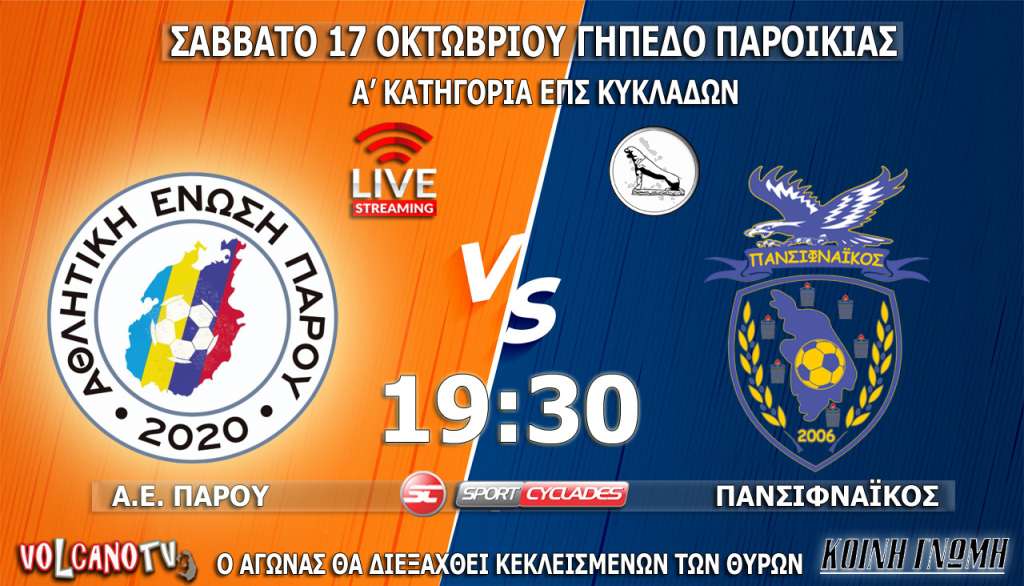 Παρακολουθήστε σε ζωντανή μετάδοση από το γήπεδο της Παροικιάς τον αγώνα μεταξύ της Α.Ε. Πάρου και του Πανσιφναϊκού.