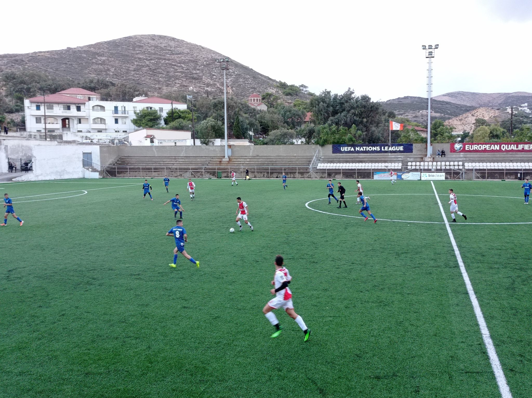 2' οι γηπεδούχοι πίεσαν την ομάδα της Τήνου, όμως οι παίκτες του κ. Μάλλιου κατάφεραν να διώξουν τη μπάλα μακριά.