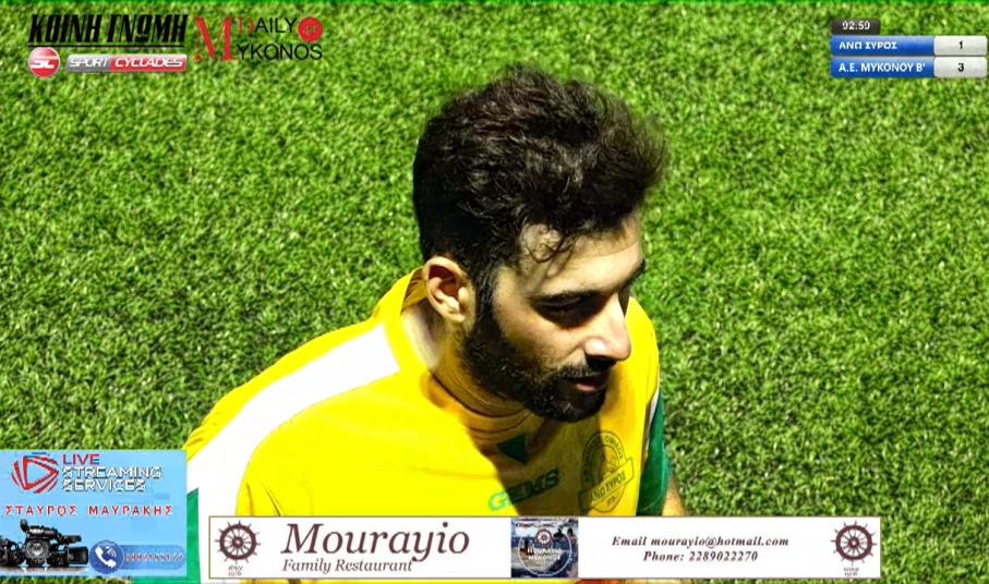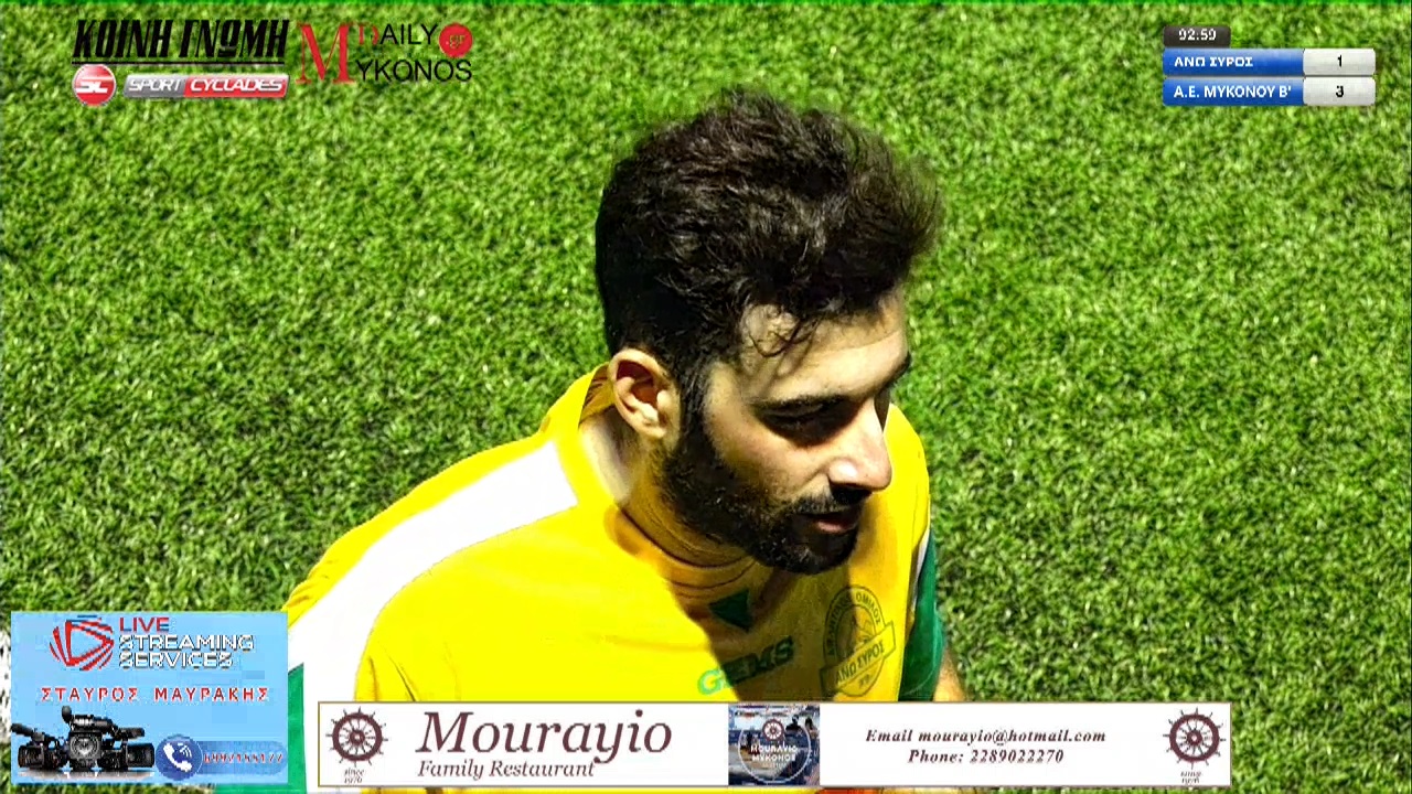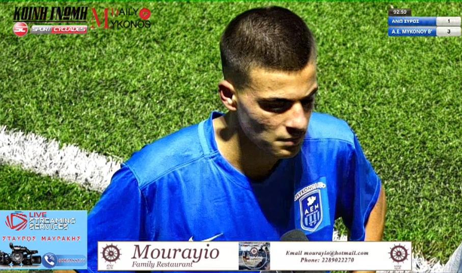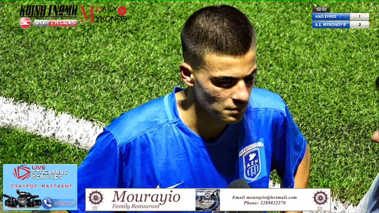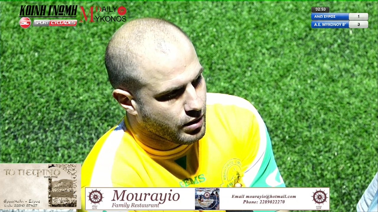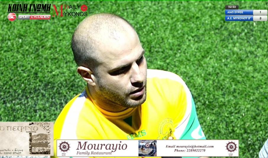 Η Α.Ε. Μυκόνου Β’ επικράτησε στο γήπεδο της Ερμούπολης με 1-3 της Άνω Σύρου σε ένα αρκετά καλό παιχνίδι κι από τις δύο ομάδες. Βασίλης Κοτζαπαναγιώτης, Μπενίτος Σαγκινέτος από πλευράς Άνω Σύρου, αλλά και Άλκης Γκέζος από την Α.Ε. Μυκόνου Β’ μιλούν στην κάμερα της Κοινής Γνώμης, για το παιχνίδι. Επίσης ο Μπενίτος Σαγκινέτος αναφέρεται και στο χτύπημα που δέχθηκε στο 82’ και τα γεγονότα που ακολούθησαν.
