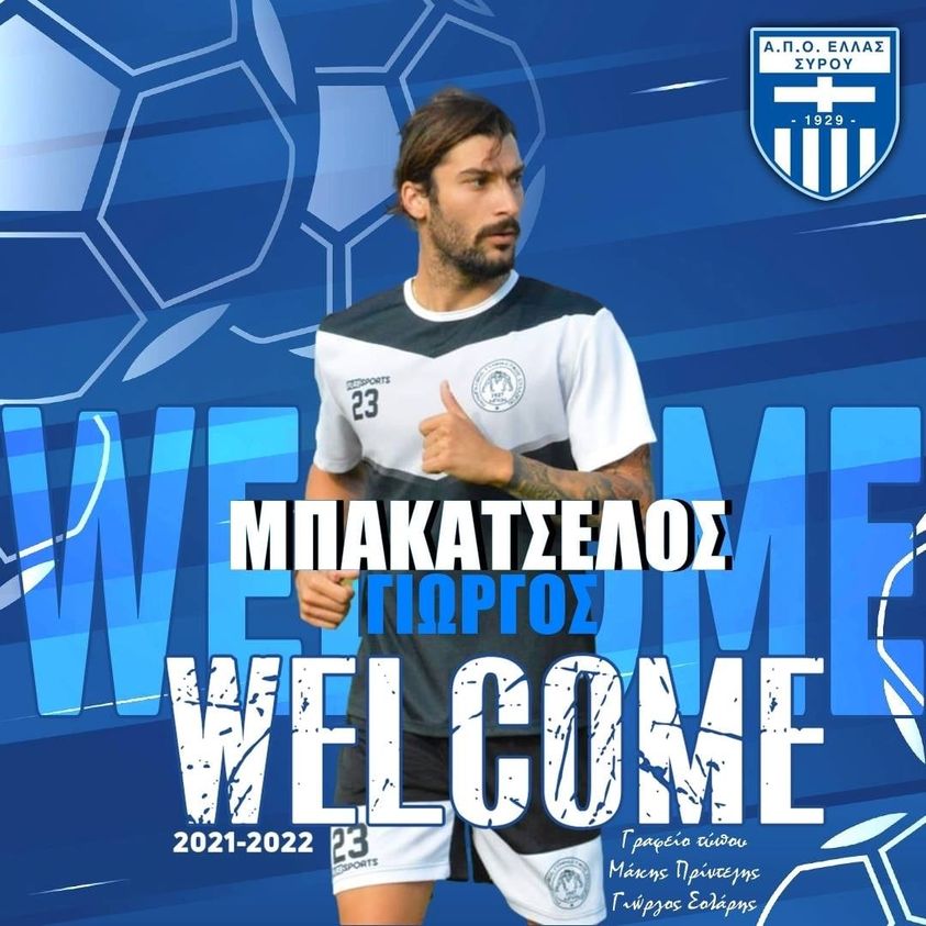 "Το διοικητικό συμβούλιο του Α.Π.Ο Ελλάς βρίσκεται στην ευχάριστη θέση να ανακοινώσει την έναρξη της συνεργασίας με τον ποδοσφαιριστή Γιώργο Μπακατσέλο. Ο 28χρονος μέσος από το Αίγιο έρχεται με τις καλύτερες συστάσεις στην Σύρο και γεμάτο βιογραφικό. Μετά από 15ετή παρουσία στον Απόλλωνα Αιγίου, πέρασε και από το Διακοφτό, ενώ παράλληλα έχει υπάρξει συμπαίκτης στον Παναιγιάλειο με τον ήδη ποδοσφαιριστή μας Βασίλη Μπούνα. Τον καλωσορίζουμε στην «οικογένεια» μας".
