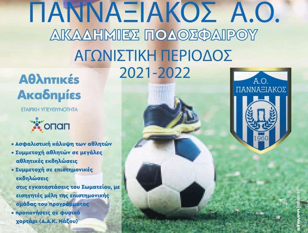Ο Πανναξιακός Α.Ο. σε συνεργασία με της Αθλητικές Ακαδημίες ΟΠΑΠ – Εταιρική Υπευθυνότητα προσφέρουν στα νέα παιδιά, από 5 έως 16 ετών, που αγαπούν και θέλουν να ασχοληθούν με το ποδόσφαιρο, ένα πλήρες πακέτο υπηρεσιών και προνομίων: