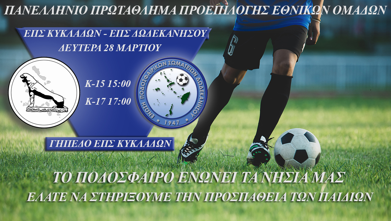 Οι μικτές ομάδες της ΕΠΣ Κυκλάδων ρίχνονται στη μάχη των αγώνων για το πανελλήνιο πρωτάθλημα προεπιλογής των Εθνικών ομάδων. Η Κ15 ανοίγει την πρεμιέρα των αγώνων για την ΕΠΣ Κυκλάδων, η οποία τη Δευτέρα στις 15:00 θα φιλοξενήσει στο γήπεδο της Ερμούπολης την αντίστοιχη Ένωση των Δωδεκανήσων. Στις 17:00 η Κ17 θα παίξει με τη σειρά της με την ΕΠΣ Δωδεκανήσου, με τα δύο τμήματα της Ένωσης να θέλουν τη νίκη ώστε να μπουν με το δεξί στις υποχρεώσεις τους.