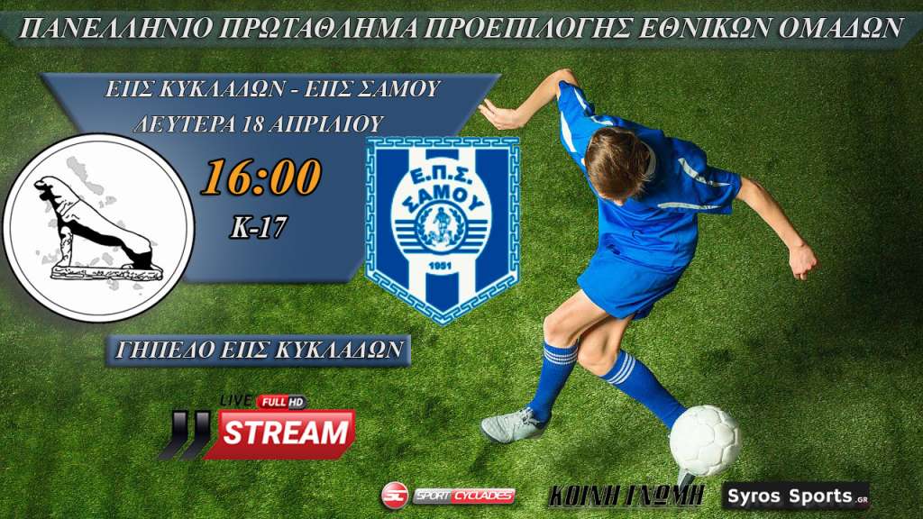 Παρακολουθήστε σε ζωντανή μετάδοση από το γήπεδο της ΕΠΣ Κυκλάδων στην Ερμούπολη της Σύρου τον αγώνα του 7ου ομίλου του Πανελληνίου Πρωταθλήματος Προεπιλογής Εθνικών Ομάδων μεταξύ των Μικτών ομάδων Κ17 της ΕΠΣ Κυκλάδων και της ΕΠΣ Σάμου.