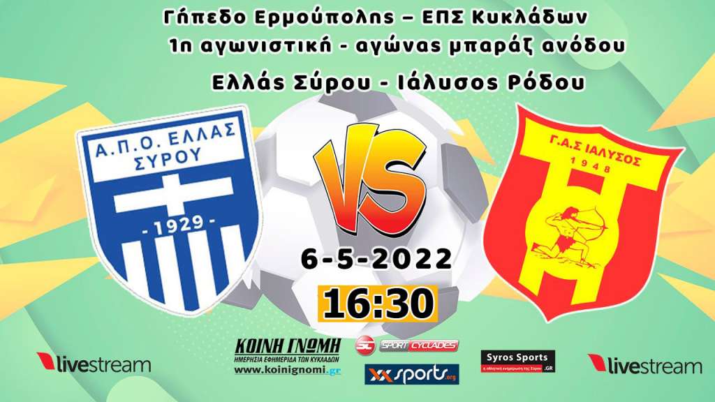 Live Stream: Ελλάς Σύρου - Ιάλυσος (Μπαράζ ανόδου στη Γ' Εθνική)