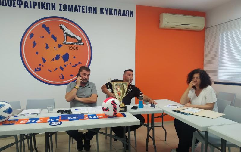 Στα γραφεία της ΕΠΣ Κυκλάδων στην Σύρο πραγματοποιήθηκαν οι κληρώσεις για τις τελικές φάσεις των τμημάτων υποδομής. Κατά τη διάρκεια της Κλήρωσης ο πρόεδρος της ΕΠΣ Κυκλάδων Ειρηναίος Φρέρης αναφέρθηκε και στα νησιά όπου θα φιλοξενηθούν οι αγώνες.