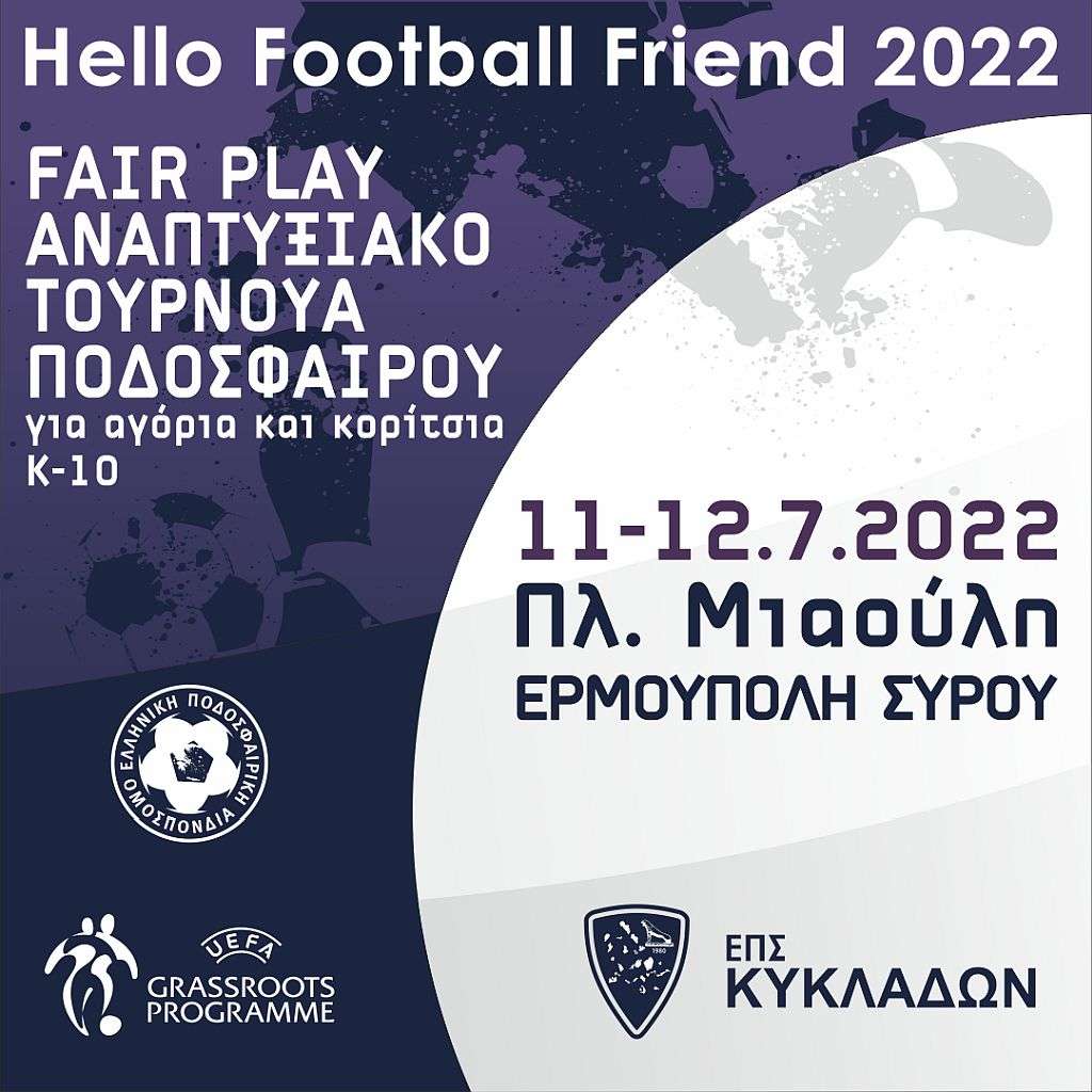 Η γιορτή στου αθλητισμού θα συνεχιστεί στη Σύρο και μετά το Stoiximan Aegean Ball Festival, καθώς στις 11 και 12 Ιουλίου στην πλατεία Μιαούλη θα πραγματοποιηθεί το «Hello Football Friend 2022» για αγόρια και κορίτσια Κ10. Συνδιοργανωτές της εκδήλωσης αυτής είναι η Περιφέρεια Νοτίου Αιγαίου και ο Δήμος Σύρου – Ερμούπολης. Το τουρνουά είναι υπό την αιγίδα της ΕΠΟ που θα εκπροσωπηθεί από τον ίδιο τον πρόεδρο της, Παναγιώτη Μπαλτάκο. Ακόμη στη Σύρο θα έρθουν ο Τεχνικός Διευθυντής Εκπαίδευσης της ΕΠΟ, Κώστας Τσάνας, αλλά και ο διευθυντής ανάπτυξης, Χρήστος Σίσκος.