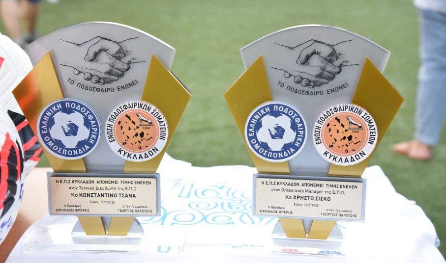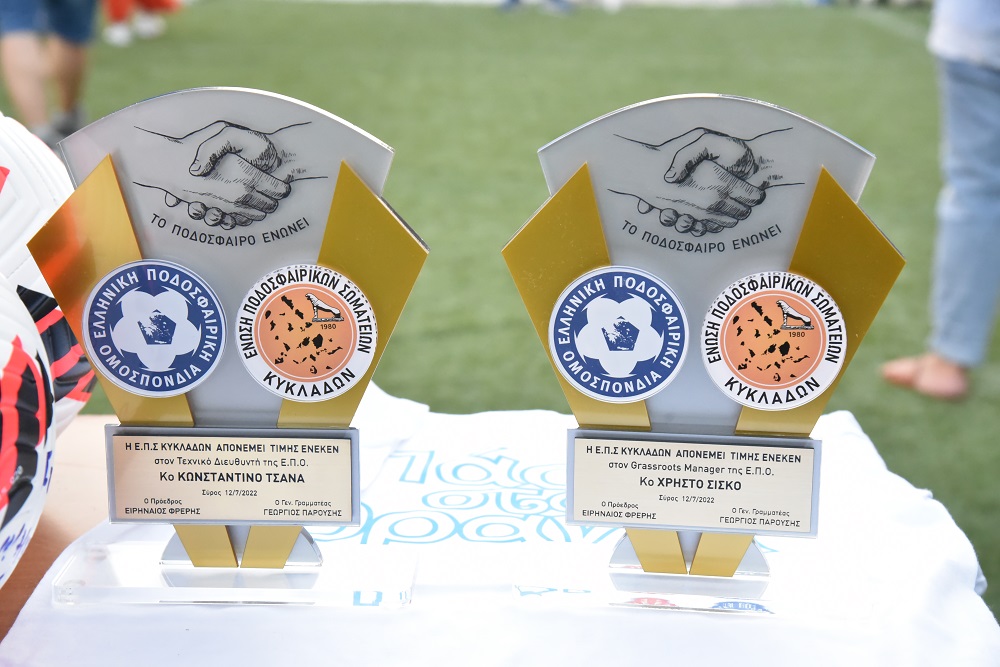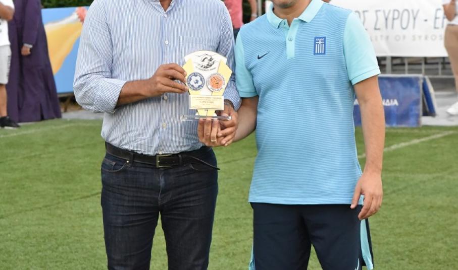 Ο κ. Λεονταρίτης, μετά το τέλος του τουρνουά και κατά τη διάρκεια της μίνι τελετής λήξης, βράβευσε τον κ. Σίσκο και ο επίτιμος πρόεδρος της ΕΠΣ Κυκλάδων κ. Σιγάλας τον κ. Τσάνα.