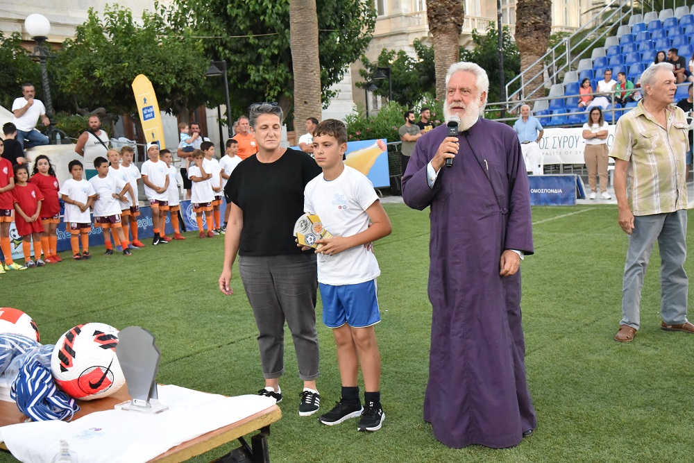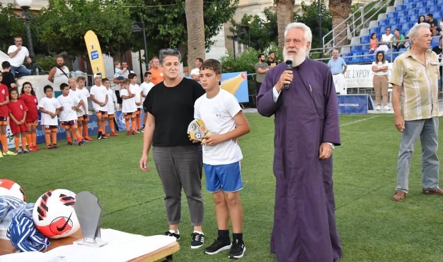 Τέλος, στην πλατεία Μιαούλη έδωσε το "παρών" και ο σεβασμιότατος Μητροπολίτης Σύρου κ.κ. Δωρόθεος Β΄ οποίος είναι γνωστό πως υπεραγαπά τα παιδιά και με τη σειρά του τίμησε τη σύζυγο και τον γιο του αείμνηστου Νίκου Φώσκολου.