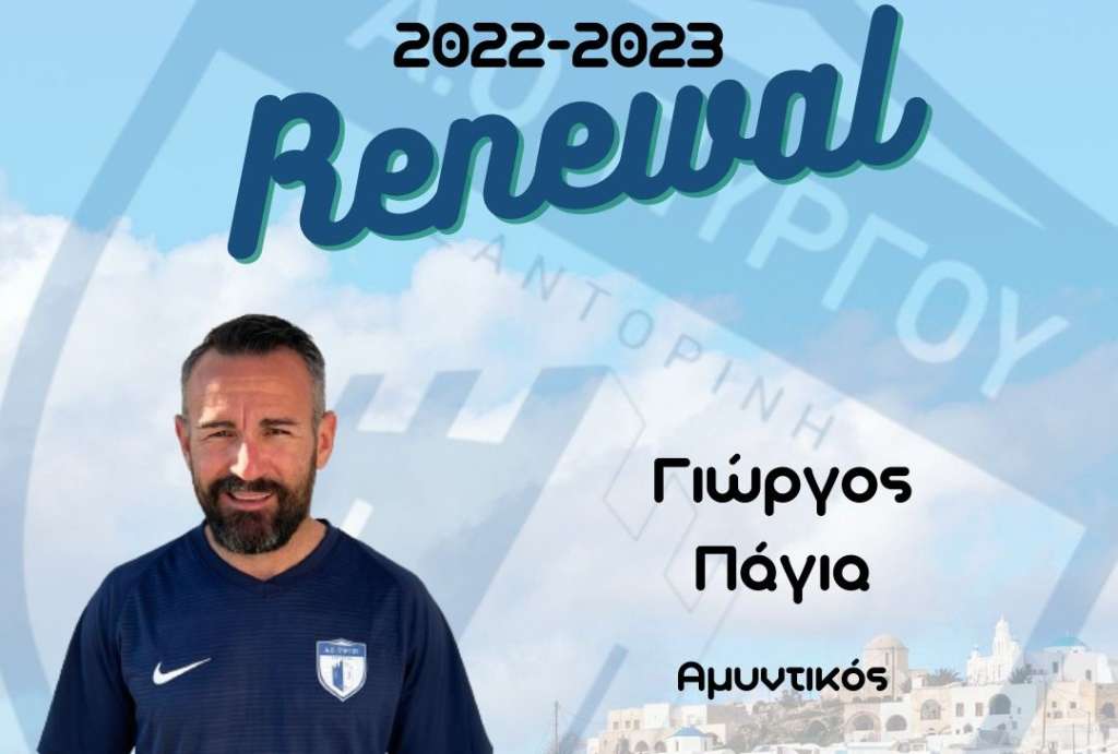 Τη φανέλα του Α.Ο. Πύργου θα συνεχίζει να φορά για ακόμη έναν  χρόνο ο Γιώργος Πάγια. Ο έμπειρος ποδοσφαιριστής, που έχει προσφέρει πάρα πολλά τόσο στο ποδόσφαιρο της Σαντορίνης όσο και των Κυκλάδων, θα συνεχίζει να αγωνίζεται στο τοπικό πρωτάθλημα. Η διοίκηση της ομάδας του νησιού δείχνει πως αναγνωρίζει όλα όσα έχει προσφέρει στον σύλλογο και αμέσως μίλησε με τον Πάγια ανανεώνοντας για ακόμη έναν χρόνο τη συνεργασία τους.