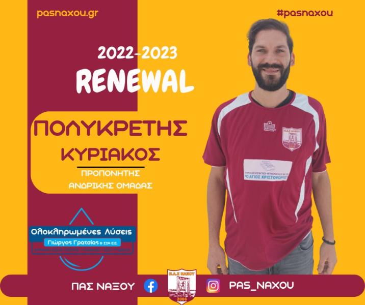 "Ο ΠΑΣ Νάξου ανακοινώνει την ανανέωση της συνεργασίας με τον προπονητή Κυριάκο Πολυκρέτη που πλέον θα αναλάβει την τεχνική ηγεσία της ανδρικής μας ομάδας.