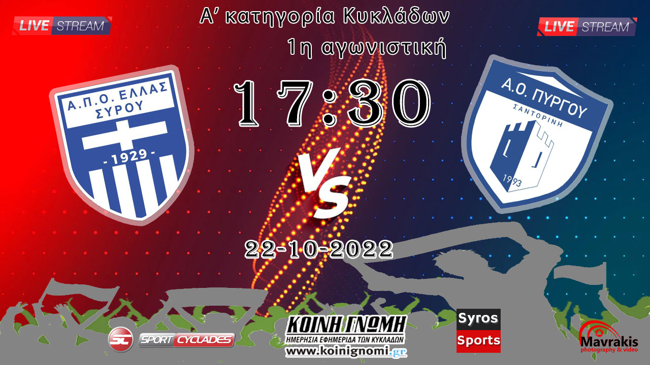 Παρακολουθήστε σε ζωντανή μετάδοση από το γήπεδο της ΕΠΣ Κυκλάδων στην Ερμούπολη τον αγώνα της 1ης αγωνιστικής του πρωταθλήματος της Α' Κατηγορίας της ΕΠΣ Κυκλάδων μεταξύ της Ελλάς Σύρου και του ΑΟ Πύργου.