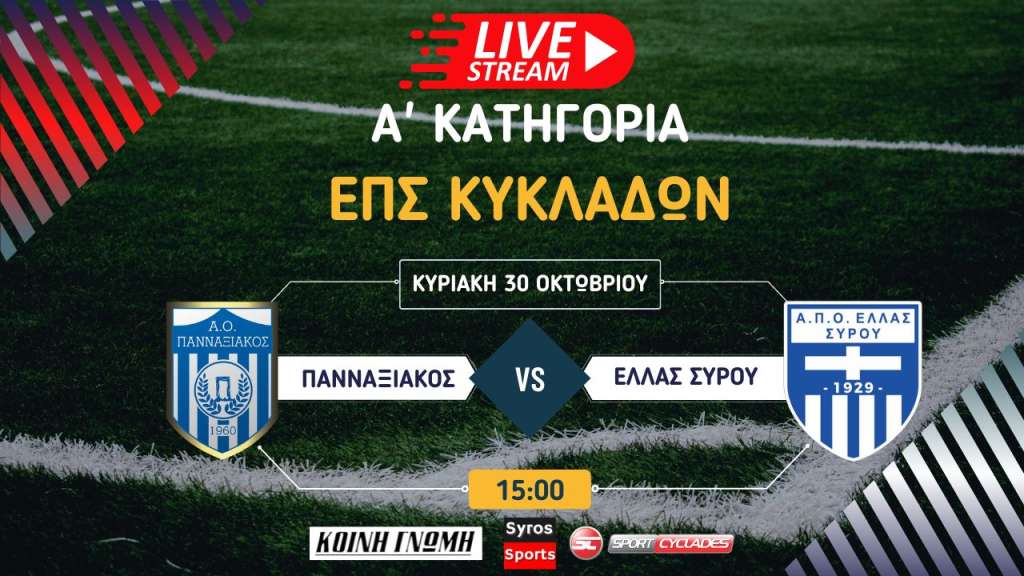 Παρακολουθήστε σε ζωντανή μετάδοση από το ΔΑΚ Νάξου την αναμέτρηση της 2ης αγωνιστικής της Α' κατηγορίας της ΕΠΣ Κυκλάδων μεταξύ του Πανναξιακού και της Ελλάς Σύρου.