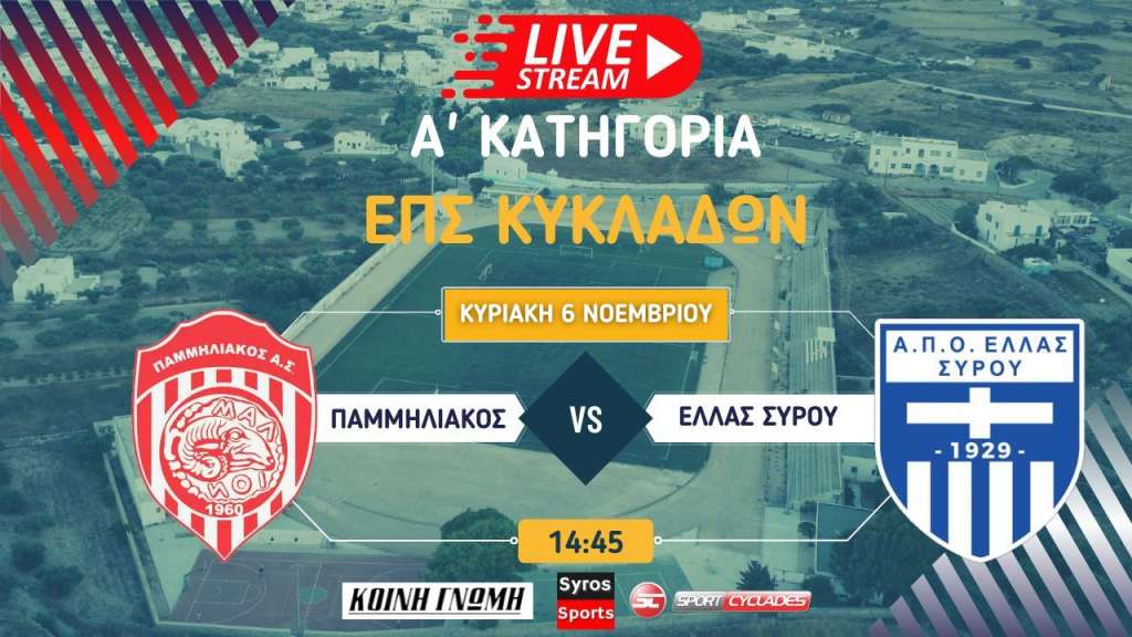 Παρακολουθήστε σε ζωντανή μετάδοση από το στάδιο της Μήλου την αναμέτρηση της 3ης αγωνιστικής της Α' κατηγορίας της ΕΠΣ Κυκλάδων μεταξύ του Παμμηλιακού και της Ελλάς Σύρου.
