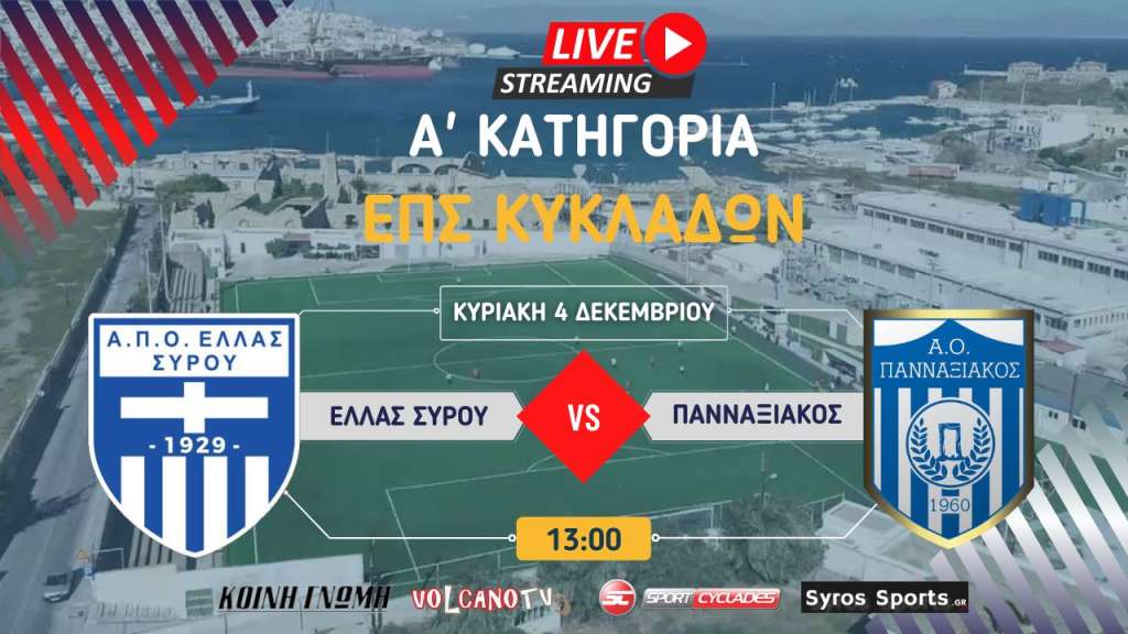 Παρακολουθήστε σε ζωντανή μετάδοση από το γήπεδο της ΕΠΣ Κυκλάδων στην Ερμούπολη τον αγώνα της 7ης αγωνιστικής του πρωταθλήματος της Α' Κατηγορίας της ΕΠΣ Κυκλάδων μεταξύ της Ελλάς Σύρου και του Πανναξιακού.