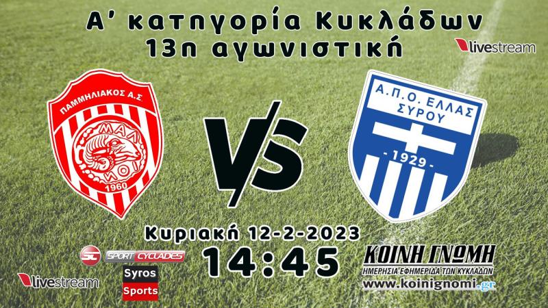 25 Μαρ. 2023 - 19:34 - Τον Παμμηλιακό φιλοξενεί η Ελλάς Σύρου