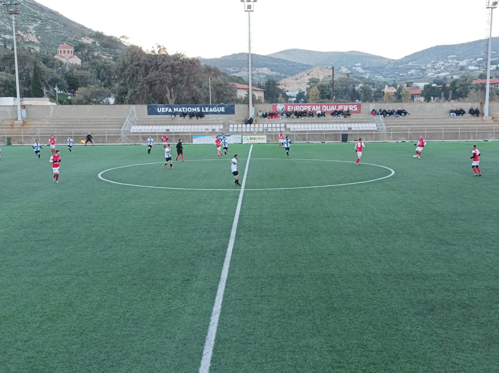 Τώρα όσον αφορά το αγωνιστικό σκέλος της αναμέτρησης ο Αίαντας Σύρου ήταν καλύτερος καθ’ όλη τη διάρκεια της αναμέτρησης κι έφτασε δίκαια στη νίκη. Οι Συριανοί, αν και δημιούργησαν αρκετές καλές ευκαιρίες στο πρώτο μέρος, κατάφεραν να στείλουν μόλις μία φορά τη μπάλα στα δίχτυα, με τον Μουλίδη στο 23’ να ανοίγει το σκορ. Η ομάδα του Χρήστου Πελέκη στάθηκε άτυχη δύο φορές στο πρώτο μέρος, καθώς τόσο η προσπάθεια του Ξαγοράρη στο 7’, όσο και του Ραμπαβίλα στο 31’ σταμάτησαν στο δοκάρι του Απέργη.
