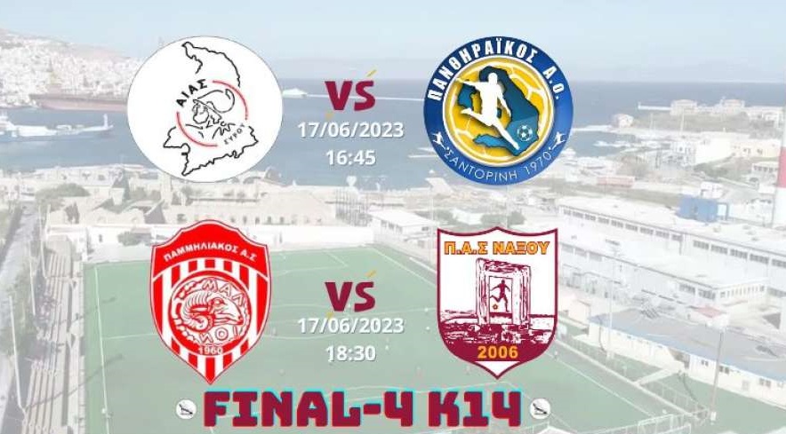 Το πρόγραμμα του Final Four της Κ14 έκανε γνωστό η Ένωση Ποδοσφαιρικών Σωματείων Κυκλάδων. Το Σαββατοκύριακο η Σύρος θα φιλοξενήσει στο γήπεδο της Ερμούπολης την τελική φάση της Κ14, στην οποία συμμετέχουν ο Αίαντας Σύρου, ο Πανθηραϊκός, ο Παμμηλιακός και ο ΠΑΣ Νάξου.