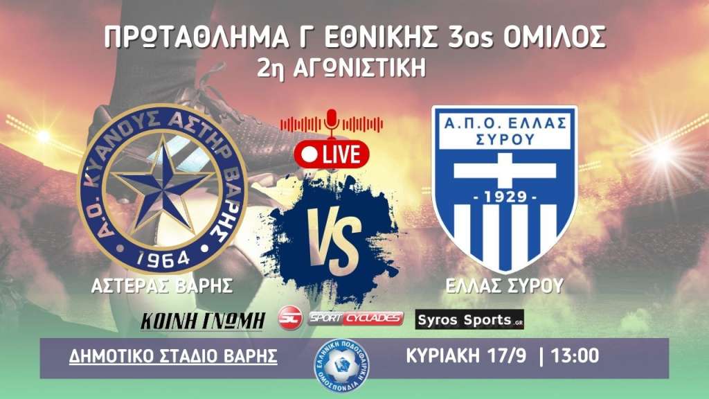 Live radio: Αστέρας Βάρης - Ελλάς Σύρου (Γ΄Εθνική | 3ος Όμιλος | 2η Αγωνιστική)