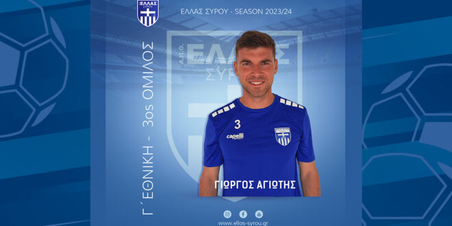 Παίκτης της Ελλάς Σύρου είναι και επίσημα ο Γιώργος Αγιώτης, ο οποίος εντάχθηκε στο δυναμικό της ομάδας έπειτα την θετική εισήγηση και του Παναγιώτη Χριστοφιλέα. Το νέο μεταγραφικό απόκτημα των Συριανών αγωνίζεται στο κέντρο της άμυνας και αναμένεται να βοηθήσει της Ελλάς σε μία θέση στην οποία είχε διαπιστωθεί πως ήθελε ενίσχυση.