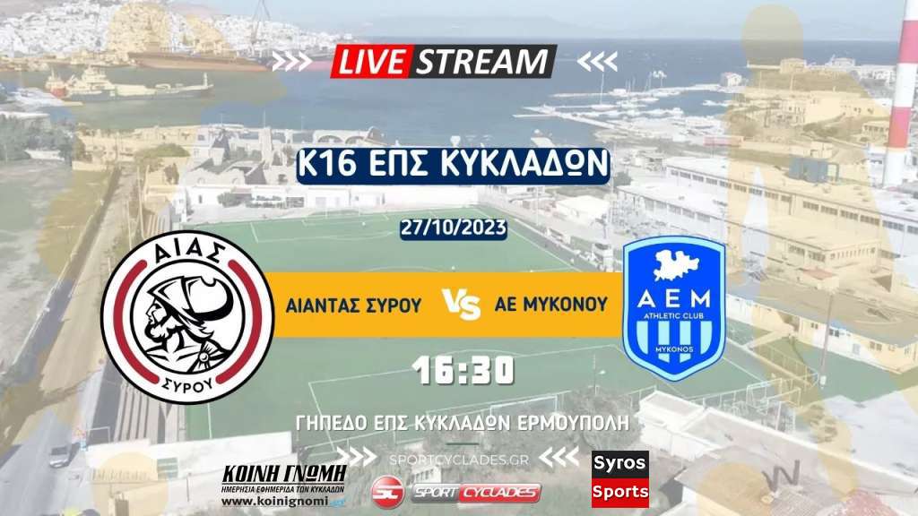 Live stream: Αίαντας Σύρου - ΑΕ Μυκόνου (Κ16 | 1ος Όμιλος | 2η Αγωνιστική)