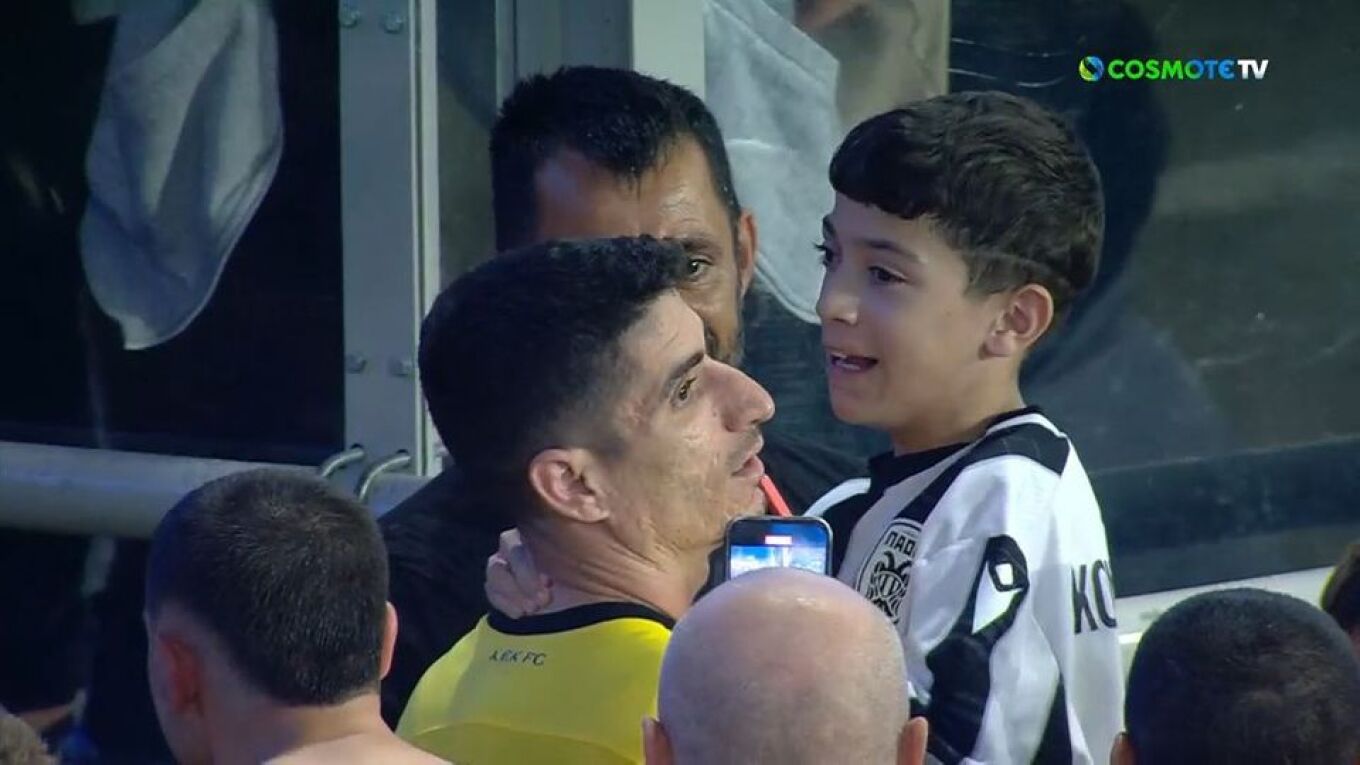 Λίγο μετά το τελευταίο σφύριγμα βρέθηκε κοντά του ο αρχηγός της ΑΕΚ Πέτρος Μάνταλος (μαζί με τον Κώστα Γαλανόπουλο), ο οποίος τον πήρε στην αγκαλιά του με τον μικρό να απολαμβάνει την κάθε στιγμή και να τον φιλά τρυφερά λέγοντας μ' αυτόν τον απλό μα τόσο αληθινό τρόπο το δικό του ευχαριστώ...